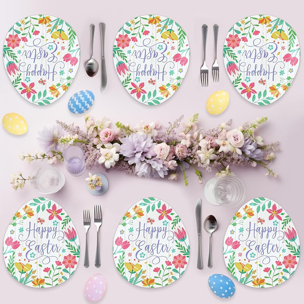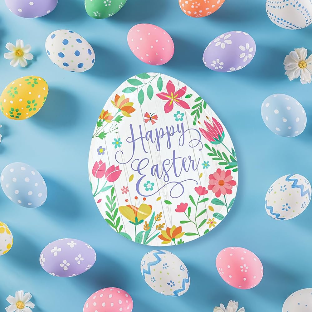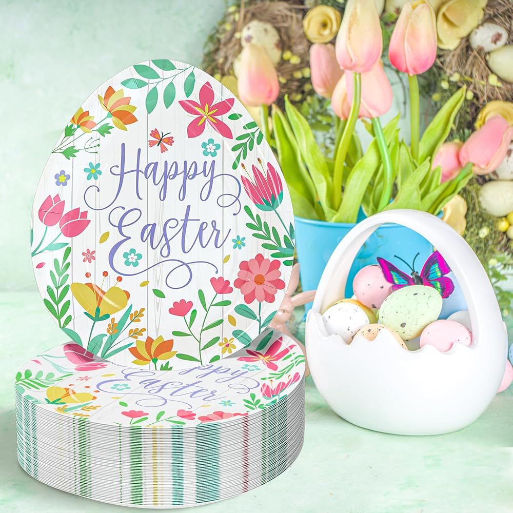 Classic Easter Party Plates: BFUN supplies an ideal of Easter Egg Shaped and Spring Flowers design for easter party decorations with classic Easter Egg elements of paper plates
