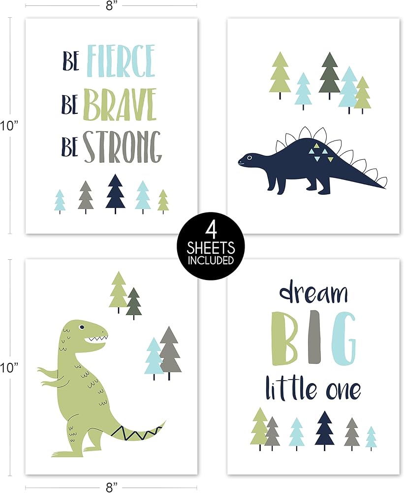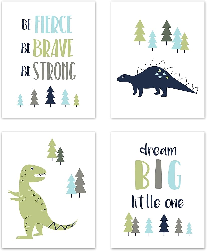 Sweet Jojo Designs Blue and Green Dream Big Dino Wall Art Prints Room Decor for Baby, Nursery, and Kids for Mod Dinosaur Collection - Set of 4