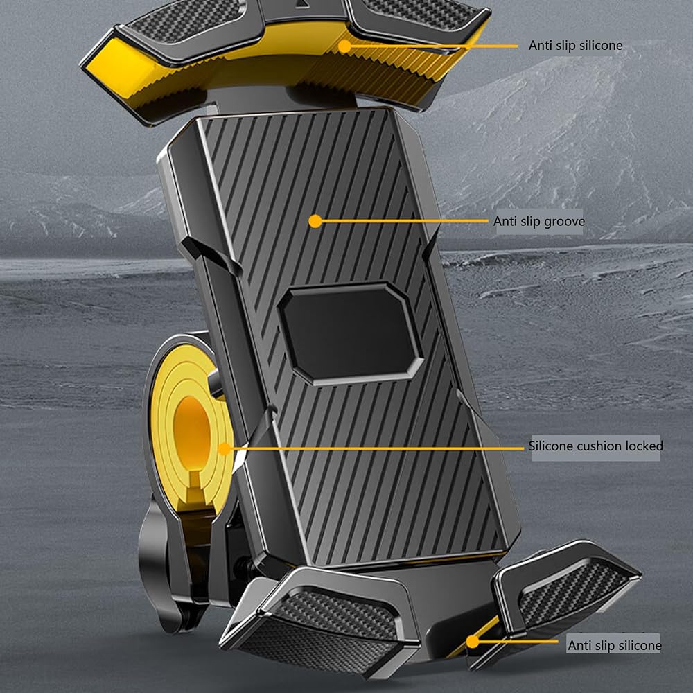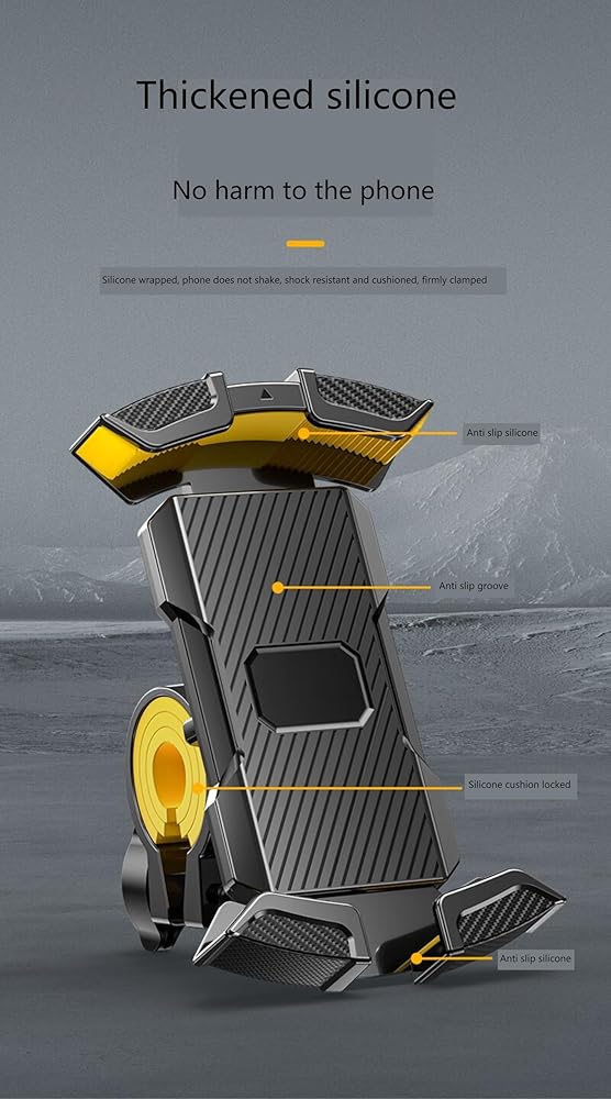 This handlebar clamp comes with 4 rubber shims to increase the grasping force, so the bike phone holder won't flip down or wiggle around. The ball-joint part used high density materials that prevents it from breaking and is tighter. There are 4 metal-made arms that are strong and super solid, so won't break like other brand or plastic ones. The backplane and 4 corners adopt soft 3D silicone pad to prevent scratches from your phone.
