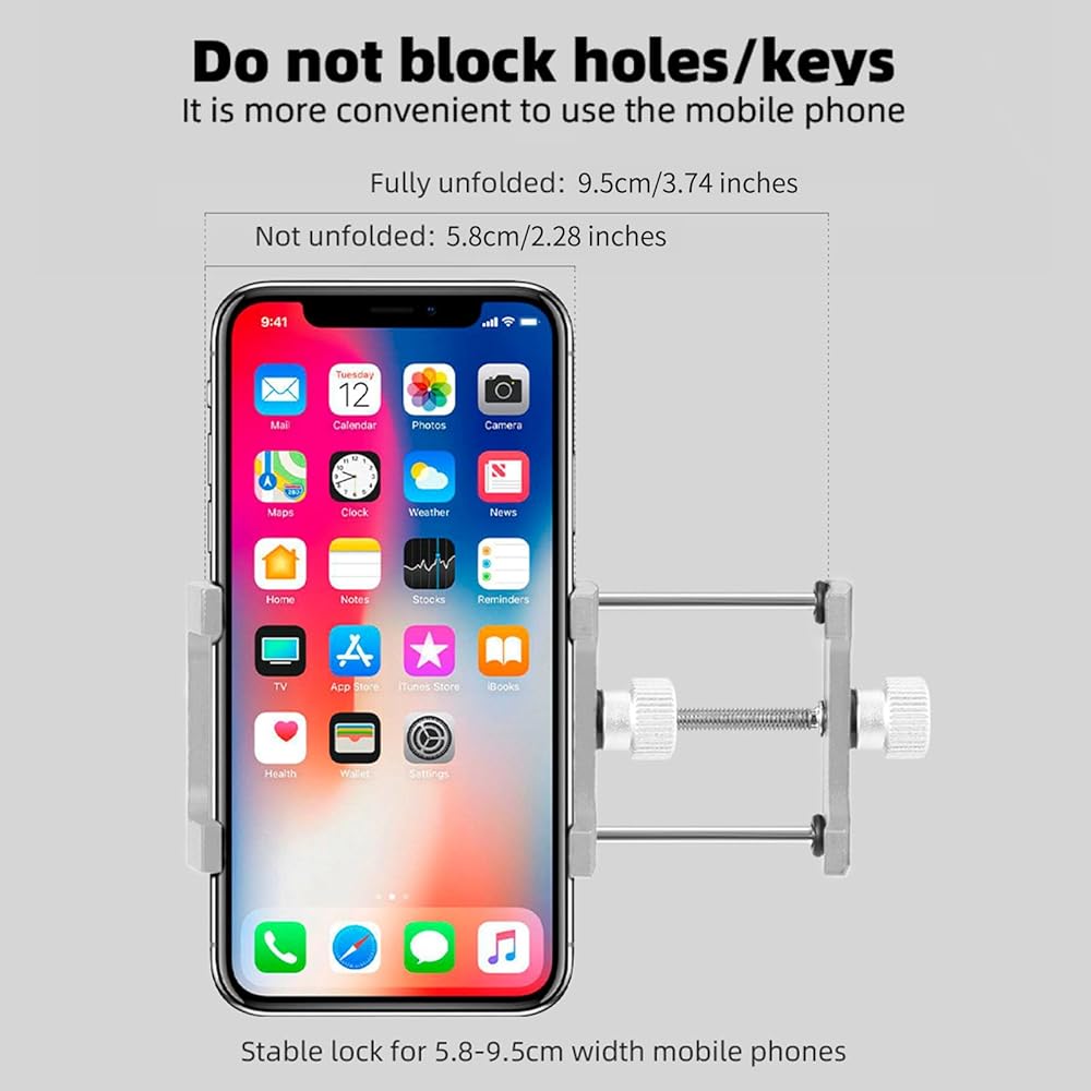 Universal Compatibility: Designed to fit phones of different sizes, this phone holder for bike accommodates various smartphone models, providing a secure and snug fit for your device, and don't block holes/keys. Suitable for 5.8-9.5cm/ 2.28-3.74 inches width mobile phones.