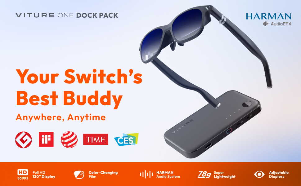 【Made With The Switch Mind】The Nintendo Switch is a uniquely portable console, but a 120” 1080p/60fps virtual display beats a 6.2” 720p/30fps screen any day. With the Mobile Dock, you can take your favorite Switch games on the go with VITURE One Smart Glasses instead! ( Please Note: Compatible with Nintendo Switch, Switch OLED; NOT Compatible with Switch Lite)
