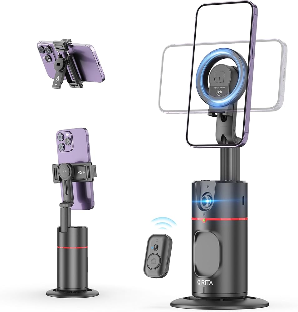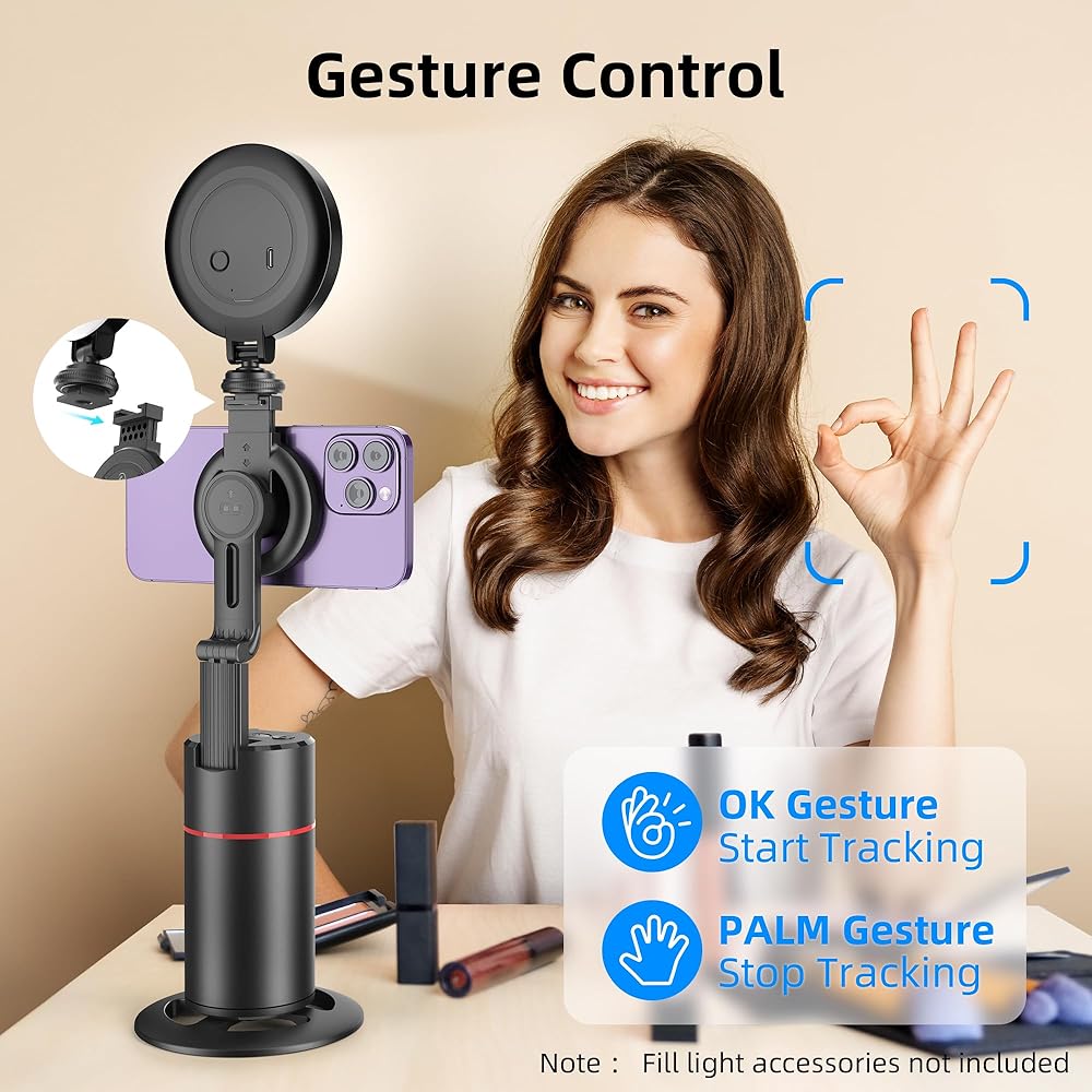 【Face Tracking & Gesture Control】This face tracking phone holder adopts AI computing system that can automatically recognize and track your face or body, 360° rotate steadily with your movement. Free your hands for video calls and live streaming. When you face camera doing "OK" gesture means turn on the tracking, while doing the "open palm" gesture means pause the tracking, which is very convenient. You can also use our included wireless remote control to connect to your phone, no App required.