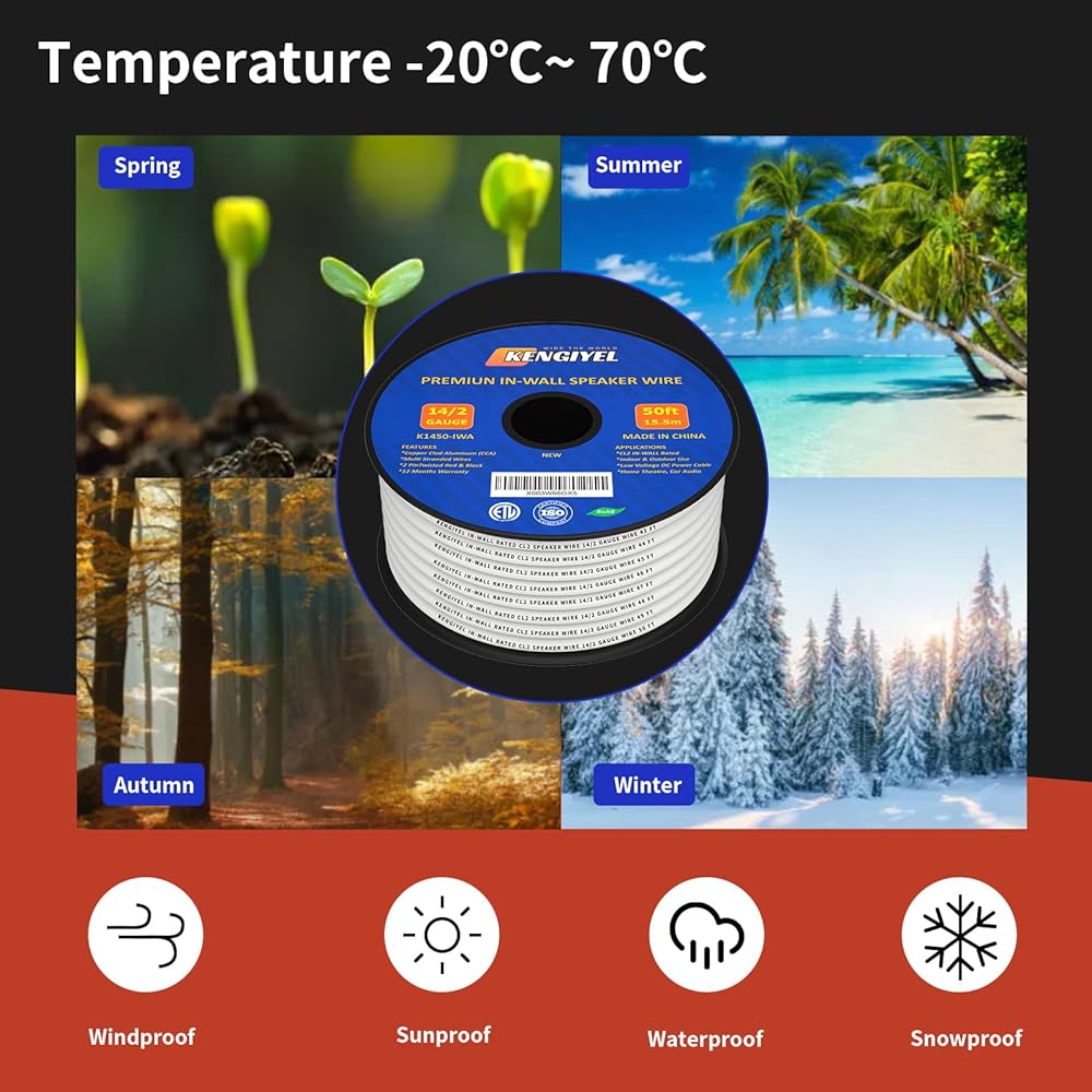 【14 GAUGE IN WALL SPEAKER WIRE】 KENGIYEL speaker wire cable comes in 2 conductors with stranded wires. Suitable for in wall, ceiling, attic, basement, office and indoor home speakers. Suitable for 12V wire gauge (12 volt wire gauge), but max voltage of 30V.