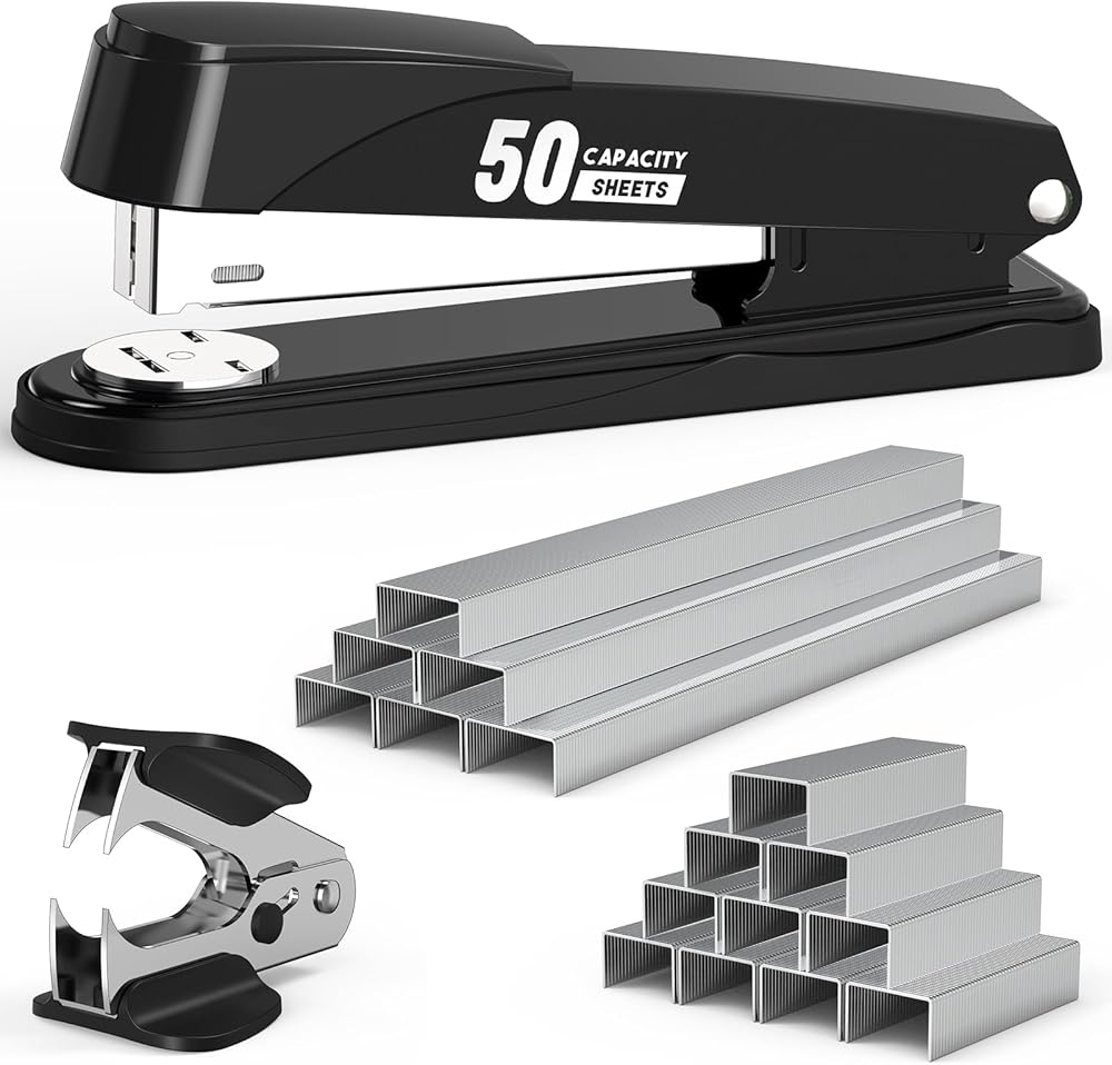 Metal Stapler Heavy Duty 50 Sheet Capacity with 1750 Staples and Staple Remover, Full Strip Staplers for Desk, No Jam, Non-Slip for Office & Classroom, Black