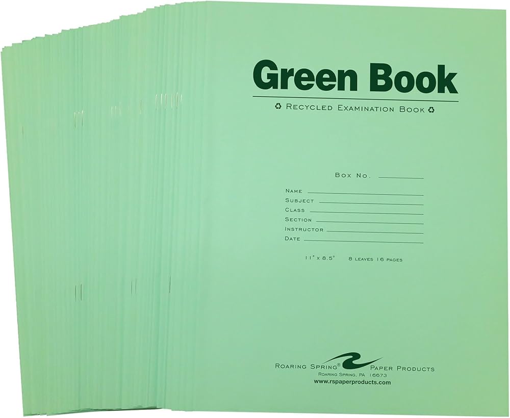 ROARING SPRING Recycled Green Exam Books, 50 School Examination Booklets, 11" x 8.5", 8 Sheets/16 Pages, Wide-Ruled with Margin Student Testbook, Made in USA