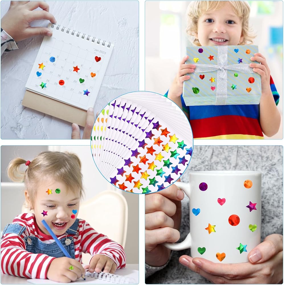 1. Shiny And Sparkly Heart Stickers: Our Dorbetar (Star 、Heart 、round) stickers are perfect for adding a touch of sparkle to any project. Each pack contains Three shapes (10 sheets each), totaling 1710 pcs of foil stickers. these stickers will surely catch the eye and bring joy to any kid's activities.