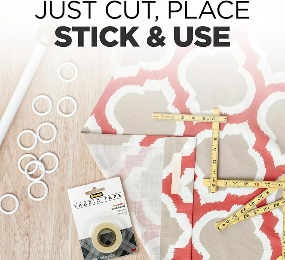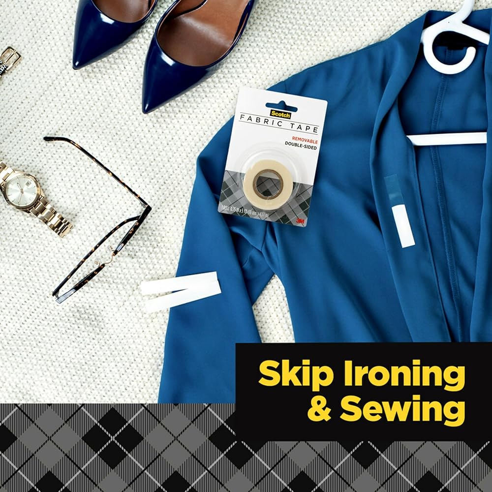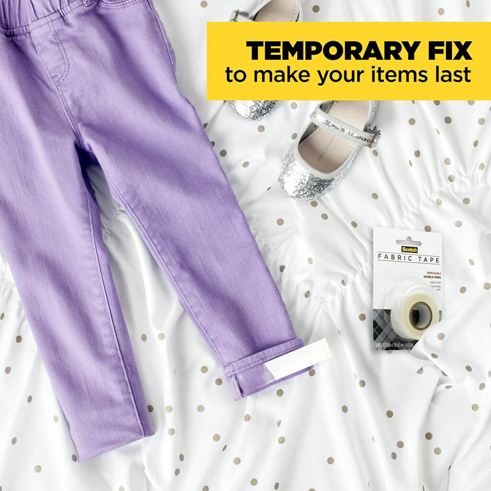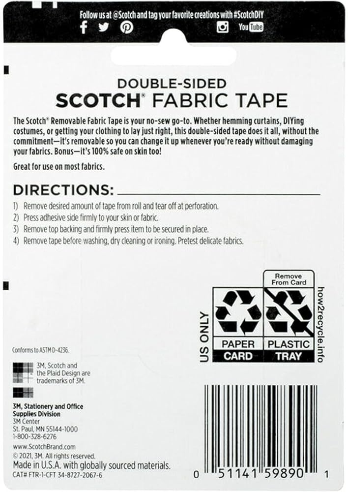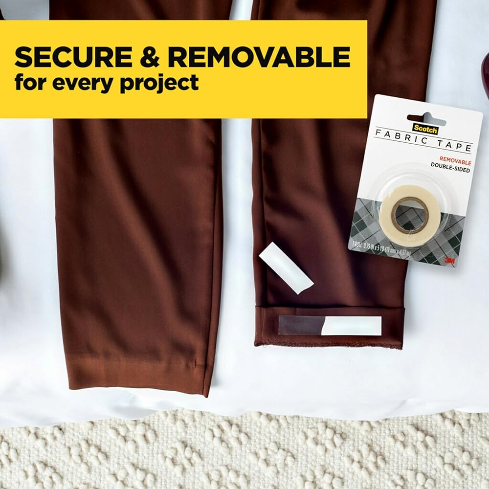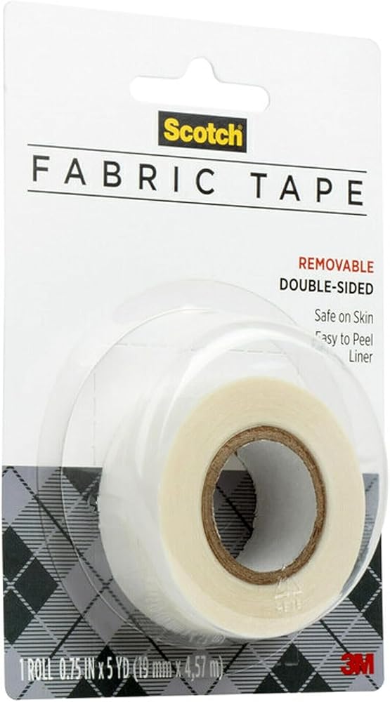 Scotch® Removable Fabric Tape featuring a unique adhesive that holds fabric securely, yet is easy to remove or reposition. It's great for layouts and crafting. It can be written on with pen, pencil or marker and will not dry out or yellow . The tape pulls off the roll smoothly and cuts easily. This roll is 3/4 in. x 180 in. with a 1 in. core . Scotch Removable Fabric Tape made in the USA with globally sourced materials.