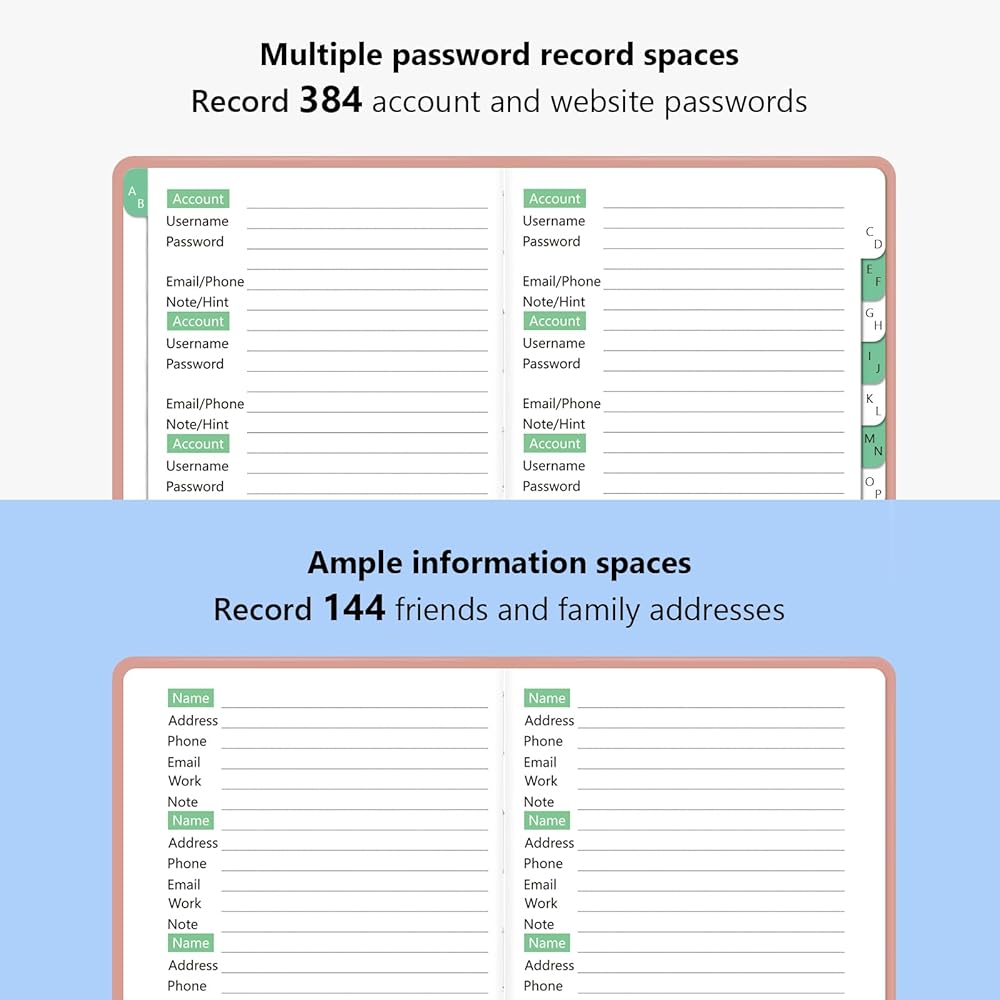 【Enough Space】160 Pages in total, 3 entries per page for passwords, 100 pages; 3 entries per page for contacts, 48 pages; 12 pages for other important information, plenty of writing space.