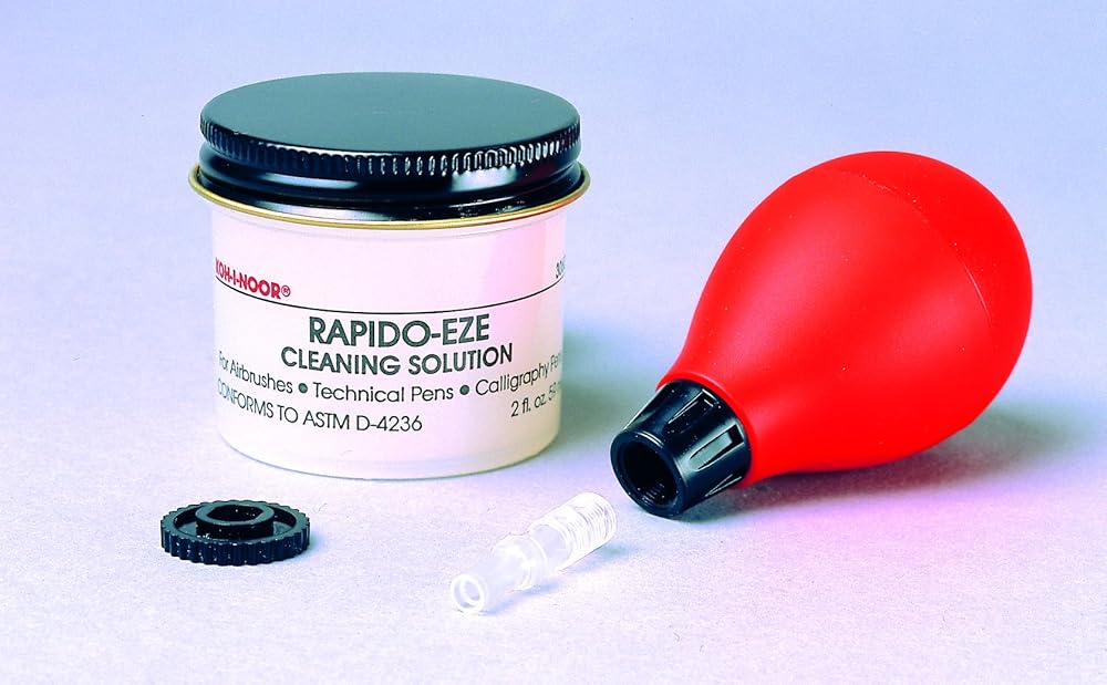 Koh-I-Noor Pressure Pen Cleaning Kit includes a pressure bulb, coupler and 2 oz. jar of Rapido-Eze Cleaning Solution. The cleaning fluid is for the quick removal and maintenance of technical pens. It unclogs pen points, technical pens, calligraphy pens and airbrushes. The cleaning solution also dissolves dried ink on all pen parts. It is non-flammable and doesn't harm plastic or metal. Keep your pens clean for long-lasting use. Made in USA. Koh-I-Noor - bringing you the best in professional grade drawing and design.