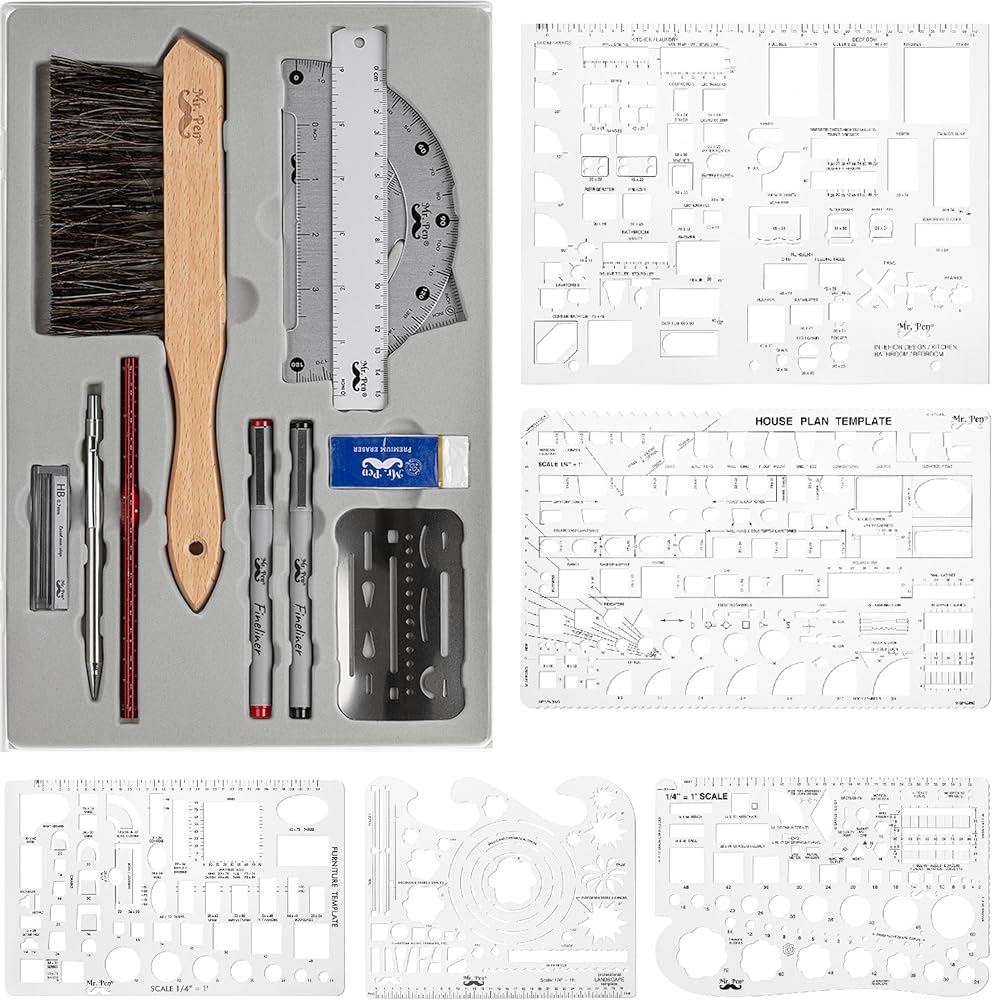 Mr. Pen- Professional Drafting Tools & Geometry Set with Case, 17 pcs, Mechanical Pencil, Fineliners, Scale Metal Ruler, Drawing Templates for Interior Design House Plan, Architect Protractor Set