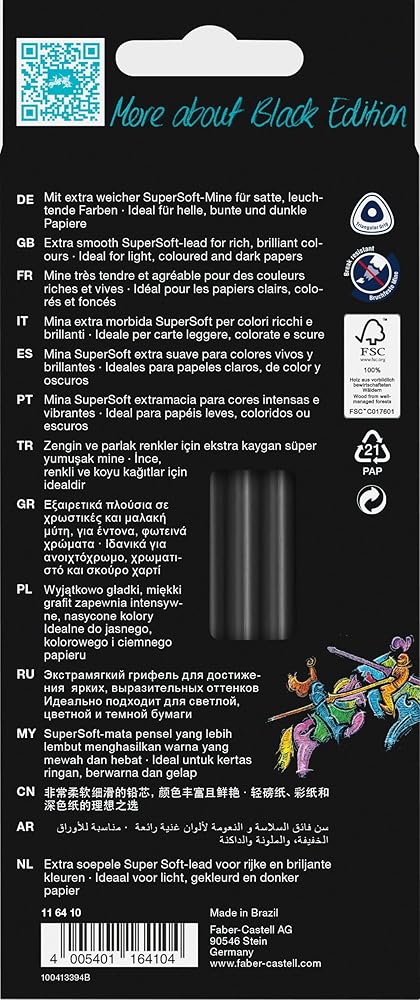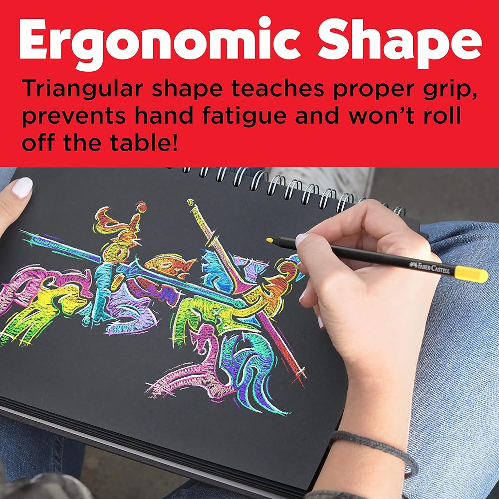 Experience endless creativity and pure color with Faber-Castell Black Edition Colored Pencils. Featuring black wood and a pre-sharpened, soft-core pencil lead, your coloring pages will pop with brilliant colors on light, colored, or even dark paper. An eco-friendly art supply choice for drawing and adult coloring, Faber-Castell colored pencils are proudly manufactured with reforested pencil wood grown in FSC-certified sustainable forests. See your artwork and adult coloring work come to life in vibrant colors with Faber-Castell pencils. Faber-Castell colored pencils feature 50 brilliant, pigment-packed colors with an extra smooth color laydown thanks to their super soft core lead. Keep your quality colored pencils on display! The pencil box doubles as a pencil holder with a fold-out design. These colored pencils are especially vibrant on dark paper, bringing a vibrant color laydown to every artwork piece. The Faber-Castell colored pencil features a triangular shape which ensures the correct grip position with optimum comfort and prevents hand fatigue when creating art. Just add creativity to bring your adult coloring books to life with brilliant colors. Faber-Castell colored pencils are of professional quality and feature an extra break-resistant lead that is glued the entire length of the pencil to ensure excellent point retention, limitless coloring, drawing, and easy sharpening. Experience creativity with Faber-Castell colored pencils! Since 1761, Faber-Castell has proudly created artist-quality tools for creatives of all ages and skill levels, designed to inspire creativity and self-expression.