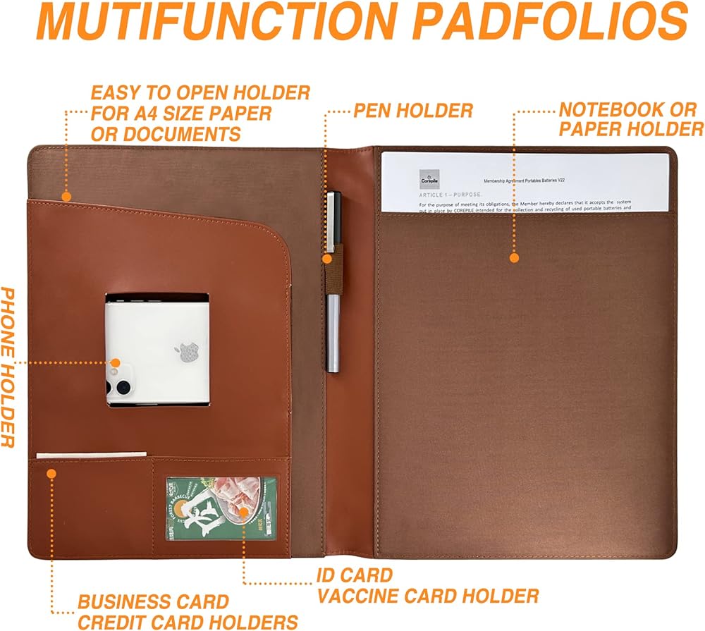Leather Portfolio Folder Padfolio, Business Padfolio Organizer Document Planner Portfolio Binder Storage Pocket for Legal Pad Holder Paperwork Phone Men Women