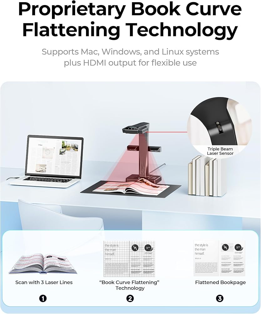 📖【Patented Flattening Curved Book Page Technology】Work with macOS 10.11 or later AND Windows XP/7/8/10/11. ET16 Plus applies CZUR's latest technology to flatten the 3D curved surface after pixel transformation to complete flattening of the book page.
