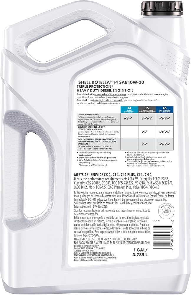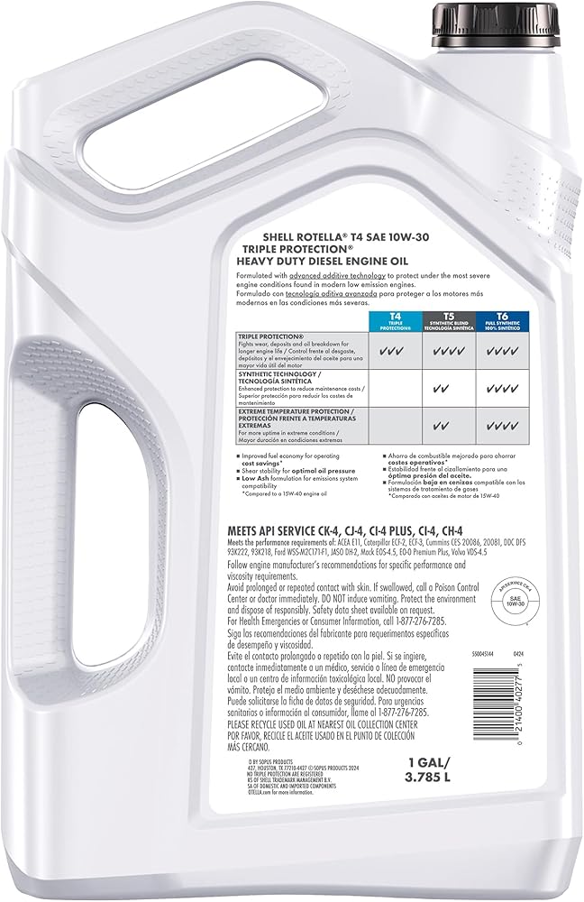 Shell Rotella T4 Triple Protection 15W-40 diesel engine oil provides exceptional wear protection for longer life in a wide range of heavy-duty engines— from diesel pickup trucks to tractors to tractor trailers. It uses advanced additive technology for superior engine cleanliness throughout the oil drain interval to protect under the most severe engine conditions found in modern, low-emission engines and older hard-working diesel engines. Shell Rotella T4 15W-40 engine oil provides deposit control that helps keep engines clean for optimum performance and long life. It effectively sustains emissions control system durability where diesel particulate filters and after-treatment systems are used. Plus, it provides enhanced protection against viscosity loss due to shear and improved oil aeration compared to the previous formulation. Shell Rotella T4 Triple Protection 15W-40 is an excellent choice for on-highway fleets, general haul, construction, agriculture, public-transport operators, diesel pickup trucks, including high-power vehicles where resistance to increased heat and stress is required. Meets or exceeds the following industry requirements: API CK-4, CJ-4, CI-4 Plus, CI-4, CH-4; ACEA E9; Allison TES-439; JASO DH-2, MA, MA2. Exceeds the requirements of the following OEM specifications: Caterpillar ECF-2, ECF-3; Cummins CES 20086, 20081; Detroit Fluids Specification (DFS) 93K222, 93K218; Deutz DQC III-10 LA; Ford WSS-M2C171-F1; MACK EO-S 4.5, EO-O Premium Plus; MAN M3575; MB-Approval 228.31; MTU Category 2.1; Volvo VDS-4.5, VDS-4. For technical questions, contact the Shell Technical Help Desk.