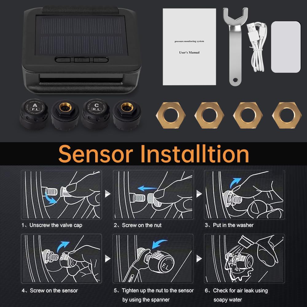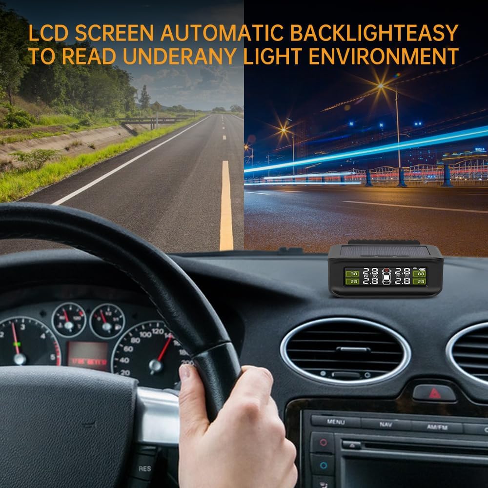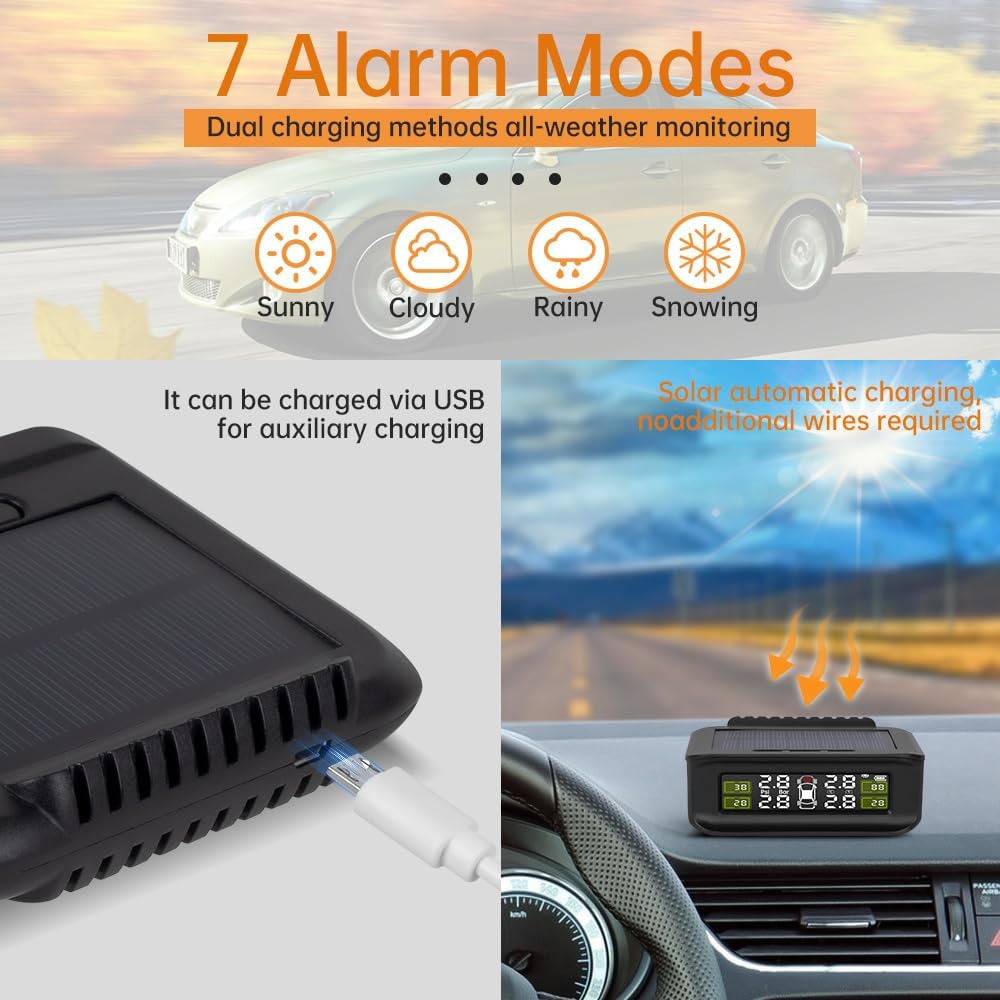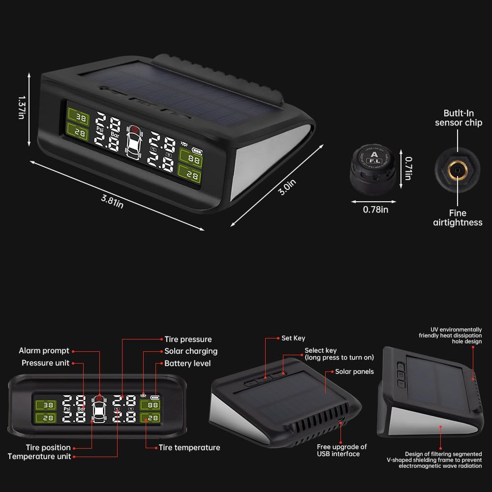 【2023 Upgrade Tire Pressure Monitoring System】Safeguard driving safety with the latest technology and chips. ①New solar panels with stronger charging power. ②The built-in chip range can be set up to 8 Bar (116Psi). ③Add anti-interference pads on both sides of the tire pressure monitor to better prevent signal interference and avoid signal cancellation issues.