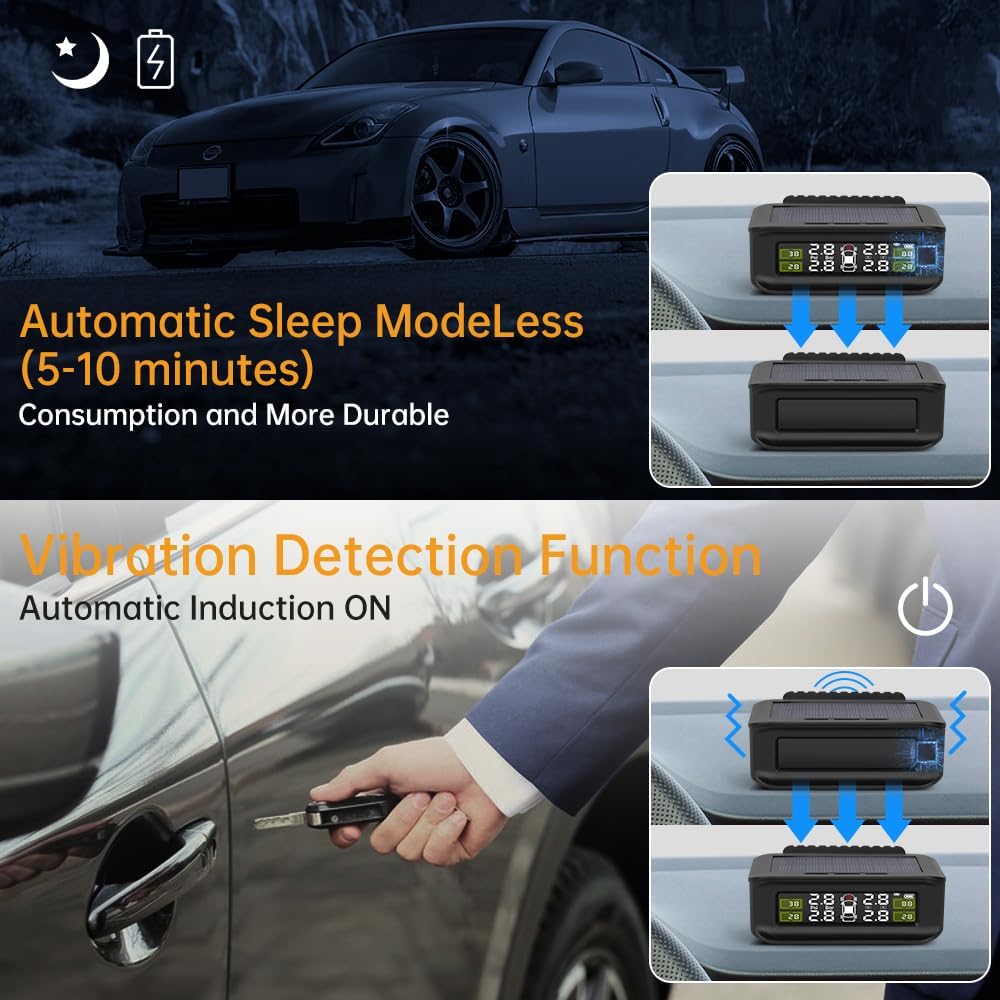 【Automatic Sleep & Vibration Monitoring】TPMS is equipped with vibration detection function, no need to manually turn on and off TPMS. after installation, manually long press the left button to turn on the monitor, when TPMS does not detect any vibration within 5-10 minutes, the monitor will automatically enter sleep mode to save power. It will automatically power on when vibration is detected again (do not manually turn off the display when using this feature.)