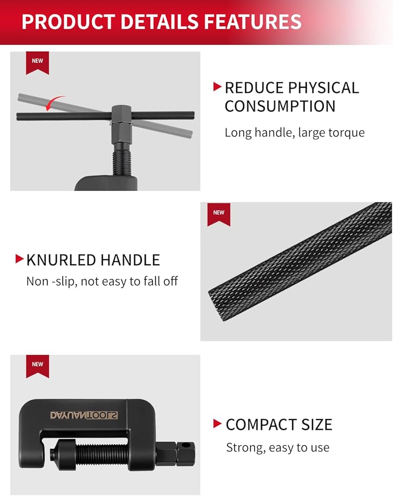 Easy to Use: Instructions – Loosen the sprocket nut, unscrew the bottom bolt on the chain press tool, and place the spring on the pin inside the tool. Then, replace the tightening bolt and remove the top bolt. Screw on the handle and lever, place the tool over your chain, and tighten the tool on the chain pin (this forces the chain and pin out the other side)