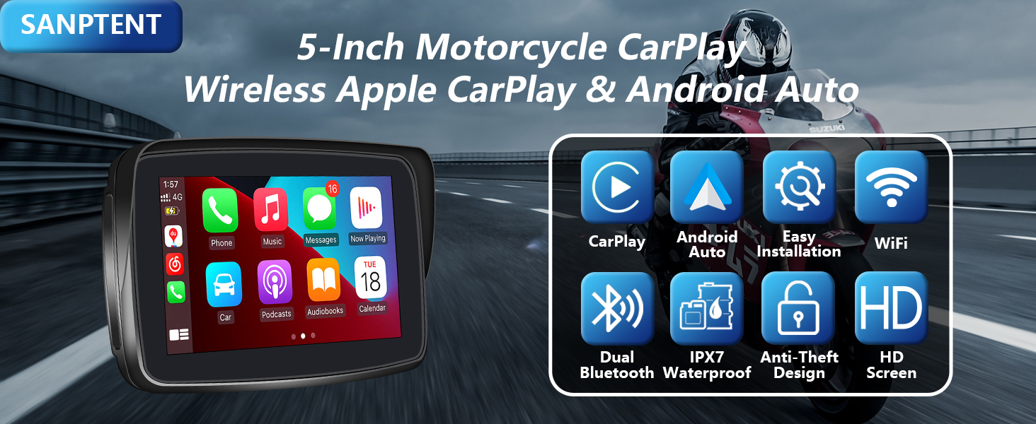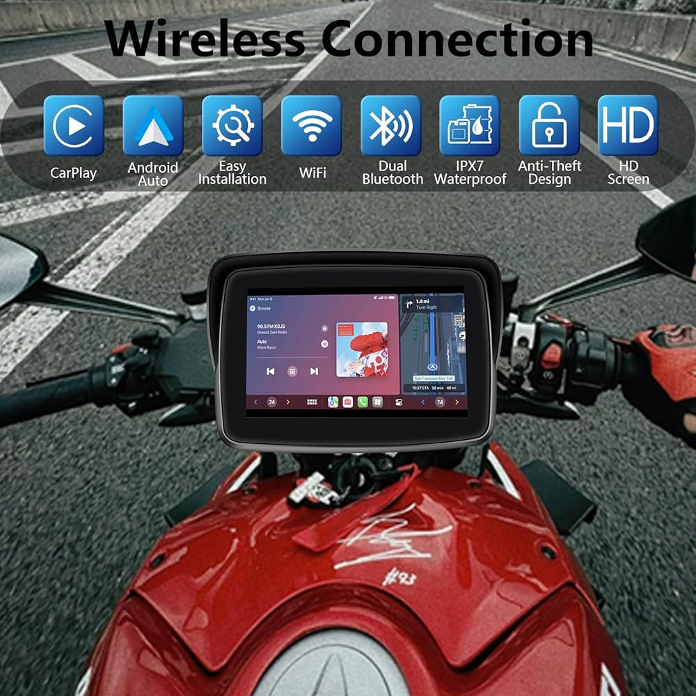 🏍️Wireless Apple Carplay &Wireless Android Auto: The Motorcycle Carplay offers Wireless CarPlay and Wireless Android Auto compatibility. While riding, you can easily access all your phone's features through its intelligent touch screen. Please note: 1. The device is not suitable for use with gloves. It is recommended to utilize voice control when wearing gloves. 2. The motorcycle Carplay does not have any built-in software or maps. All functions are dependent on Carplay and Android Auto.