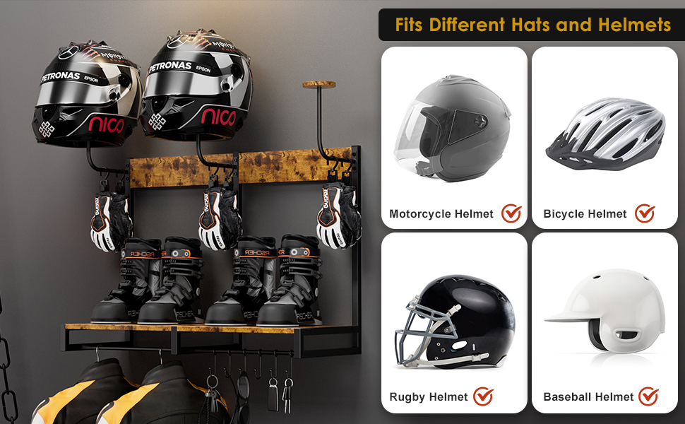 【Helmet Holder Sturdy & Durable】The motorcycle helmet rack is made of high-quality ironwood, which has strong load-bearing capacity, stability and durability, and is not easy to deform. The surface of the helmet stand wall mount has bright paint, which has good waterproof performance and will not fall off from the paint surface.