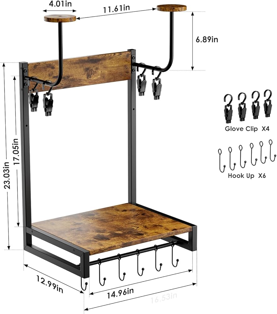 【Helmet Holder Design & Size】helmet stand is equipped with 3 helmet holder supports and adds 6/hook & 6/clips, bringing more functions to your use. The helmet wall mount is easy to install, and the size after installation is approximately 12.99 x 32.28 x 23.03 inches.