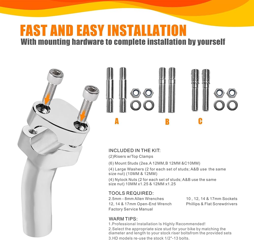 EASY TO INSTALL:▶️▶️ Package content: 2 pack of universal motorcycle handlebar risers, set of mounting hardware for easy installation. 1/2 in diameter mount bolts allow these risers to mount in most triple trees (some models may require minor but simple drilling of the riser mount holes for these bolts to install).Installs on most bikes and works with stock control lines and cables with simple re-routing on most models.
