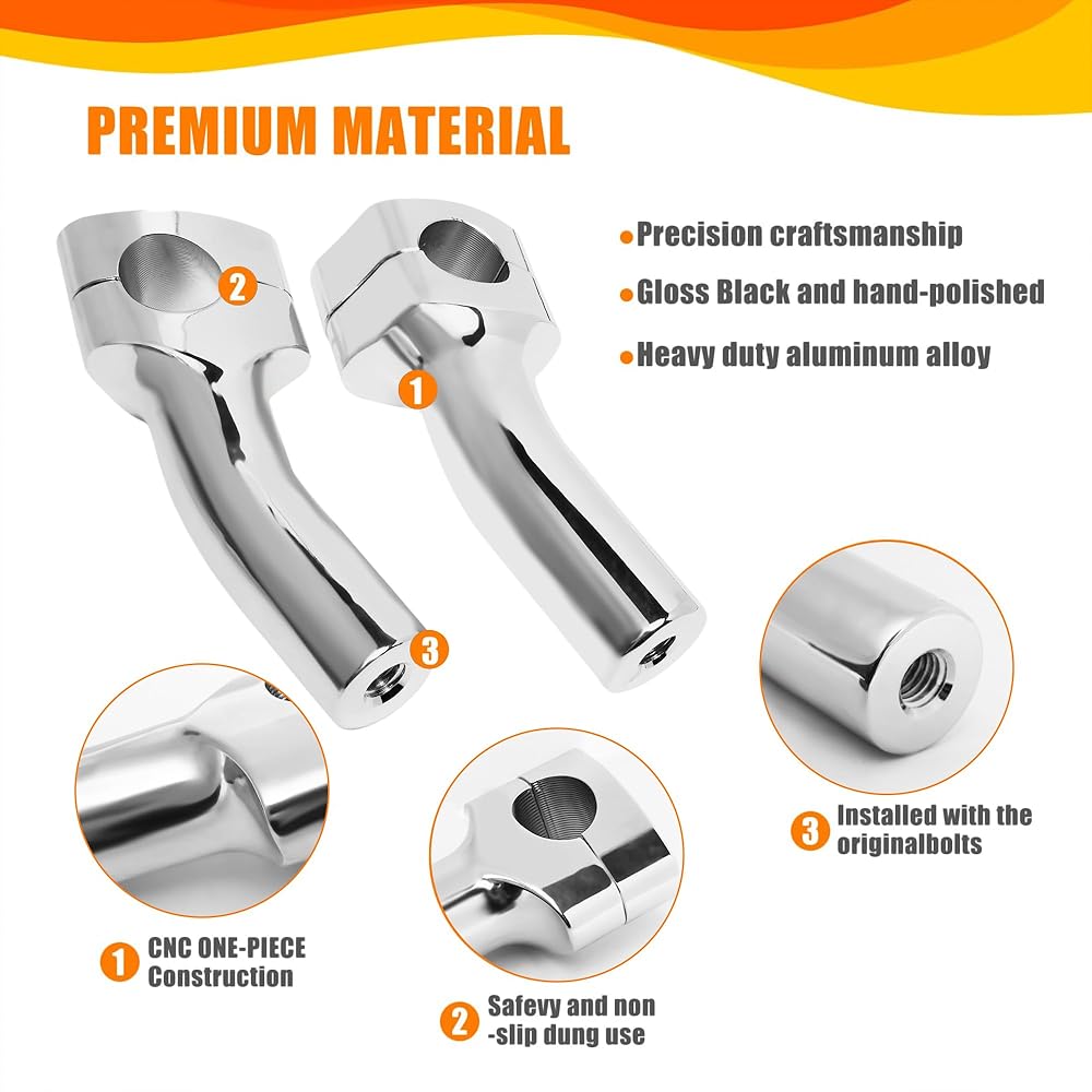 WATERPROOF AND STYLISH DESIGN:▶️▶️ The motorcycle kickback handlebar rises have glossy black painting, add more attractive look on your bike.Our handlebar riser clamps have waterproof and wear resistant features to keep your bike safe from wind and rain, while being very easy to clean with just a damp cloth.Each handlebar riser features a triple-plated bright chrome finish and has its own individual stylish cap that allows mounting of a tachometer or other accessory between the risers.