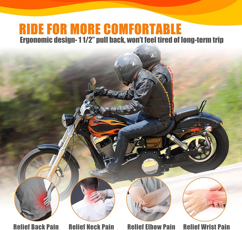 4-INCH RISING KICKBACK DESIGN:▶️▶️ Our motorcycle kickback risers provides immediate relief to those stretching to reach their handlebars. Relocates handlebar closer to the rider so that the motorcycle becomes easier to steer and control. This 4-inch of rising provide approximately 1-1/2inch of pullback. This repositioning of the rider's grip point reduces the stress and pain most riders feel in their neck, back and shoulders,which is more ergonomic than the straight handlebar riser.