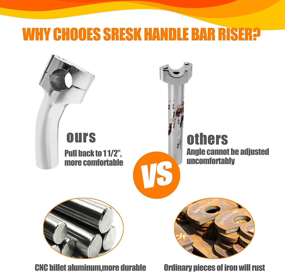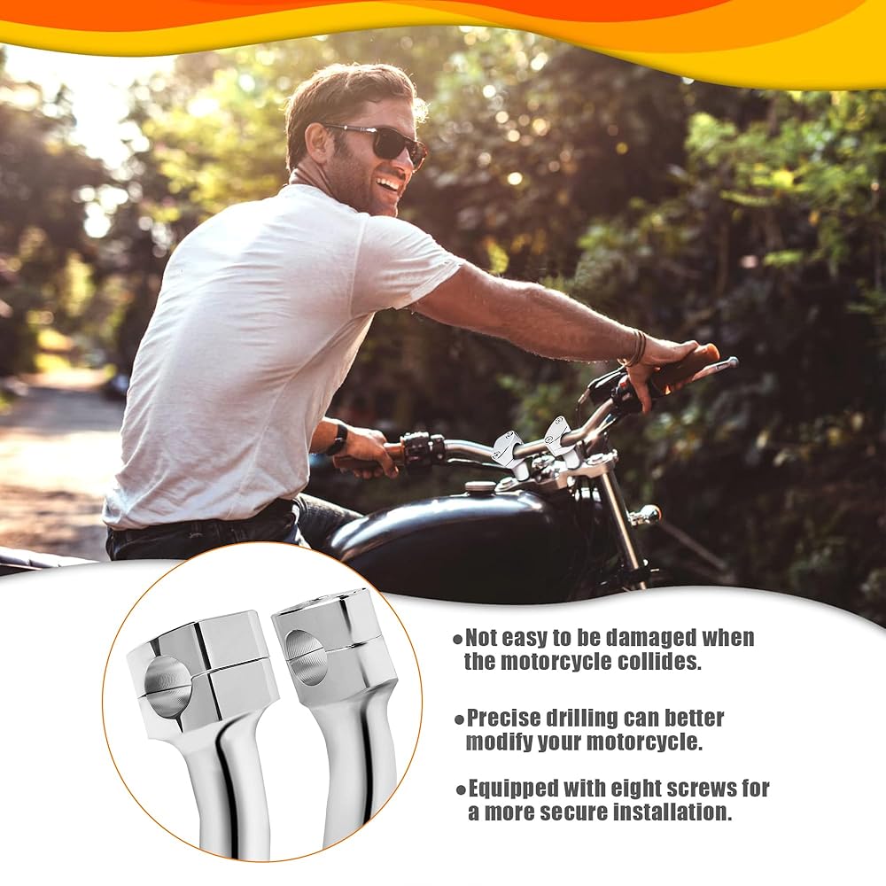CNC ONE-PIECE HANDLEBAR RISER CLAMP:▶️▶️ Our motorcycle pullback handle bar riser is made of heavy duty 6061-T6 aluminum alloy material and CNC one-piece molding process, the diameter of the handlebar reaches 1.2 inches, which has better strength,toughness and safety than the iron ones. The inner of the handle tube adopts CNC cutting anti-slip pattern, which can be more non-slip and stable. The precise position of the mounting screws can be cut to perfectly adapt the screw fittings.