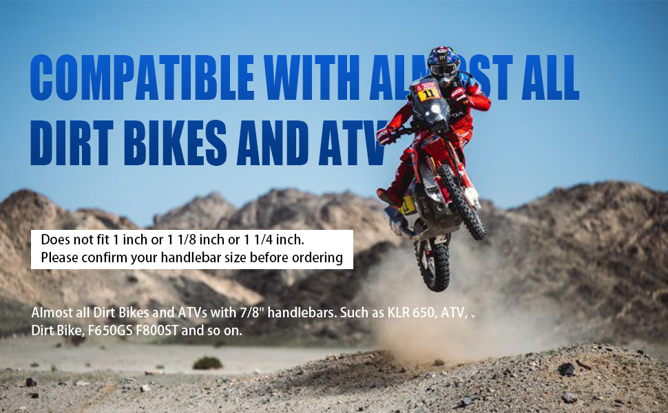 Compatible:Compatible with almost all Dirt Bikes and ATV's with 7/8" handlebarsDoes not fit 1" or 1 1/8" or 1 1/4". Please confirm your handlebar size before ordering