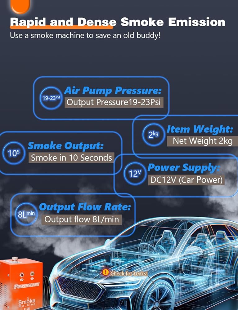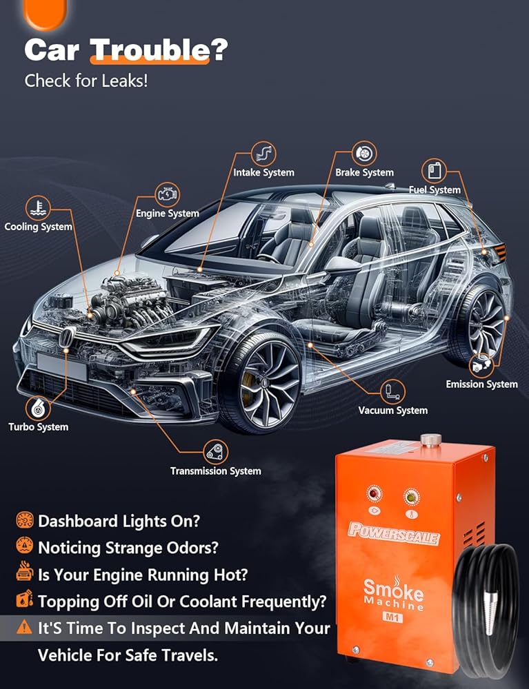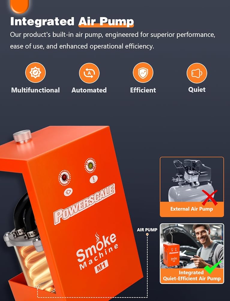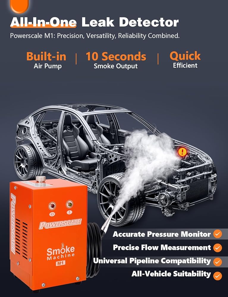 🧰【Comprehensive Leak Detection】The Powerscale M1 Automotive Smoke Machine can easily inspect various vehicles, including older models, for leaks in throttle shafts, engine blocks, turbo test systems, crankcase systems, intake systems, exhaust systems, fuel tank systems, EVAP systems, EGR systems, cooling systems, and various pipe fittings.