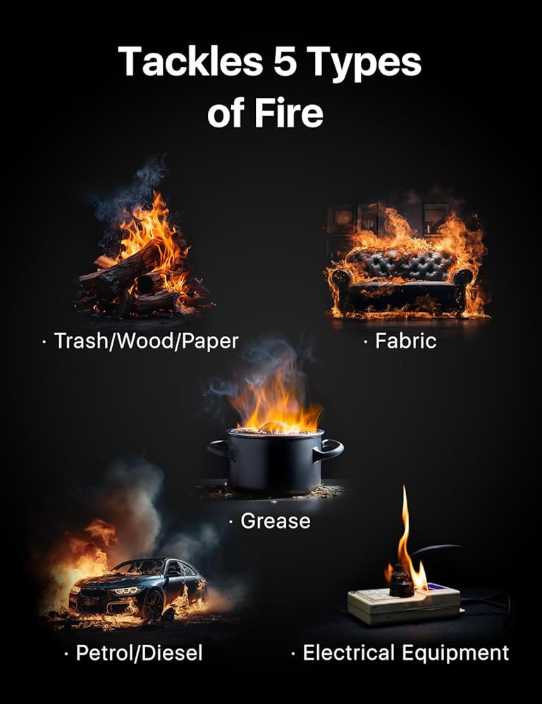 Tackles 5 Types of Fires: This fire extinguisher effectively handles fires caused by trash/wood/paper, fabric, grease, gasoline/diesel, and electrical equipment, preventing them from turning into bigger disasters