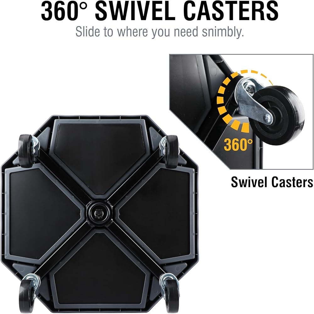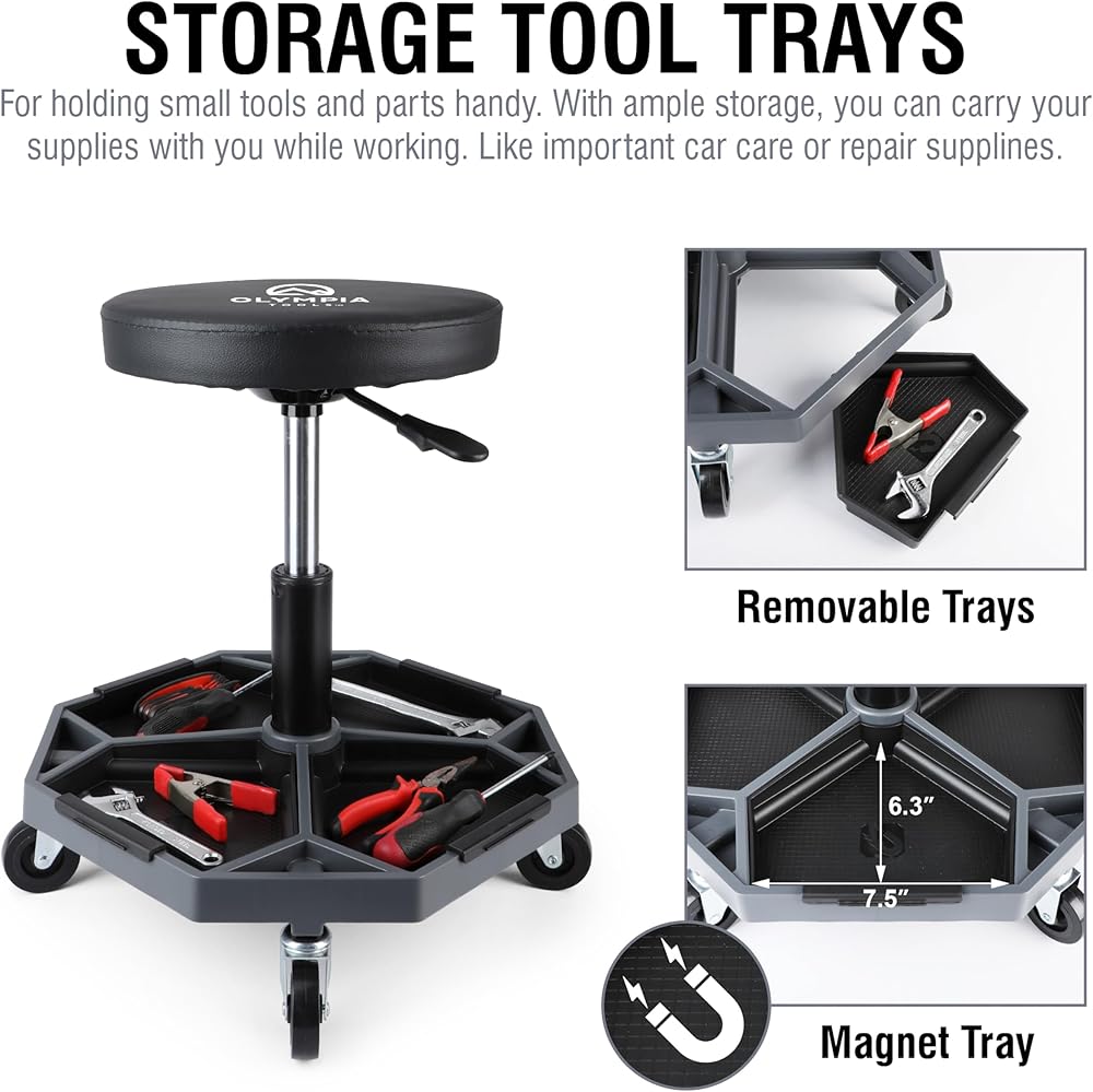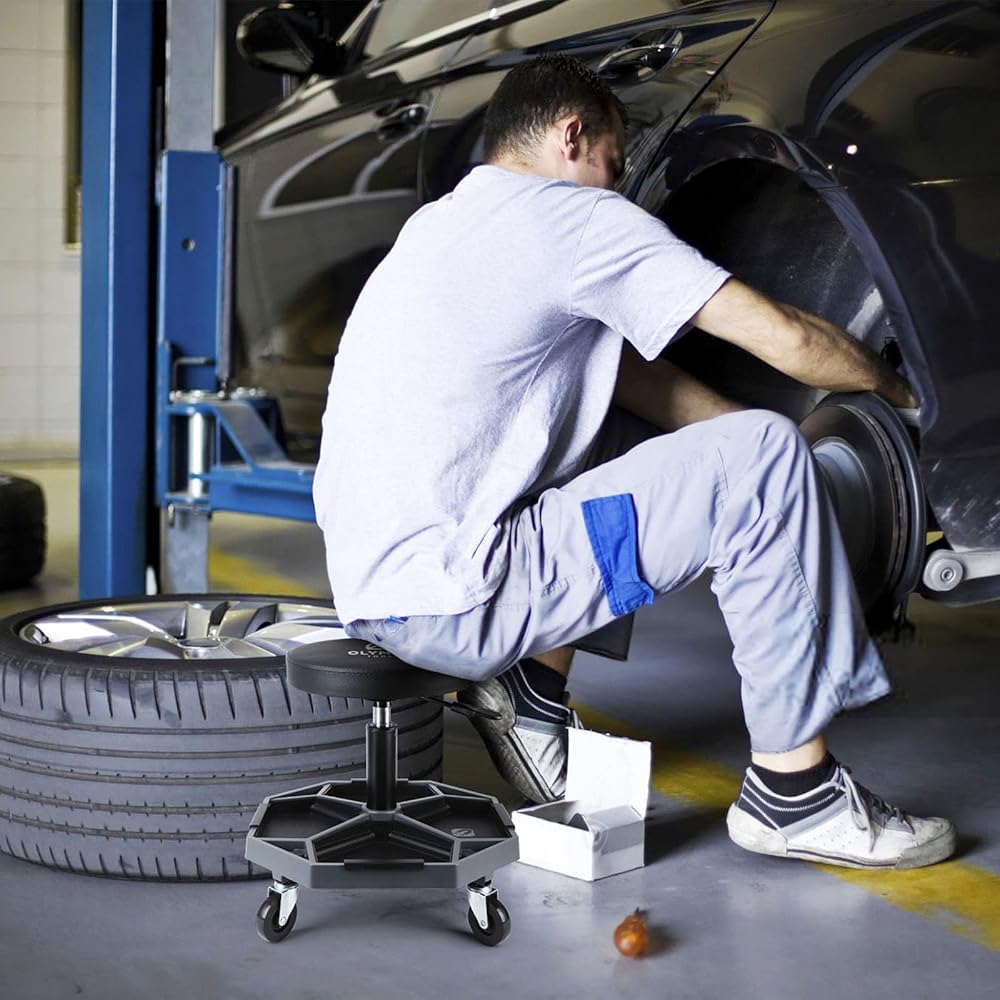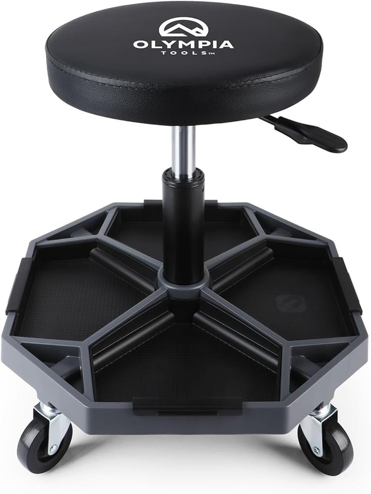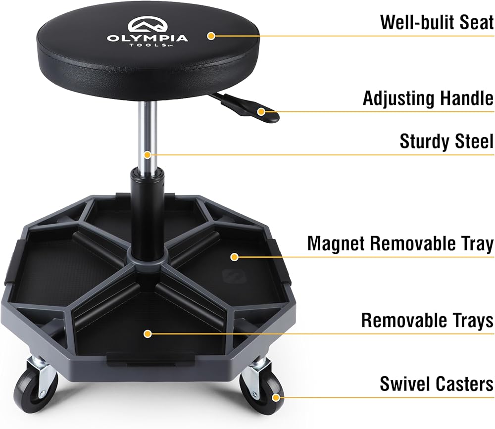Rotating Heavy Duty Stool: Seat rotates 360 degrees for maximum flexibility in the garage, workshop, home or office; Features rust resistant high polish chrome and premium grade double ring leg construction for durability