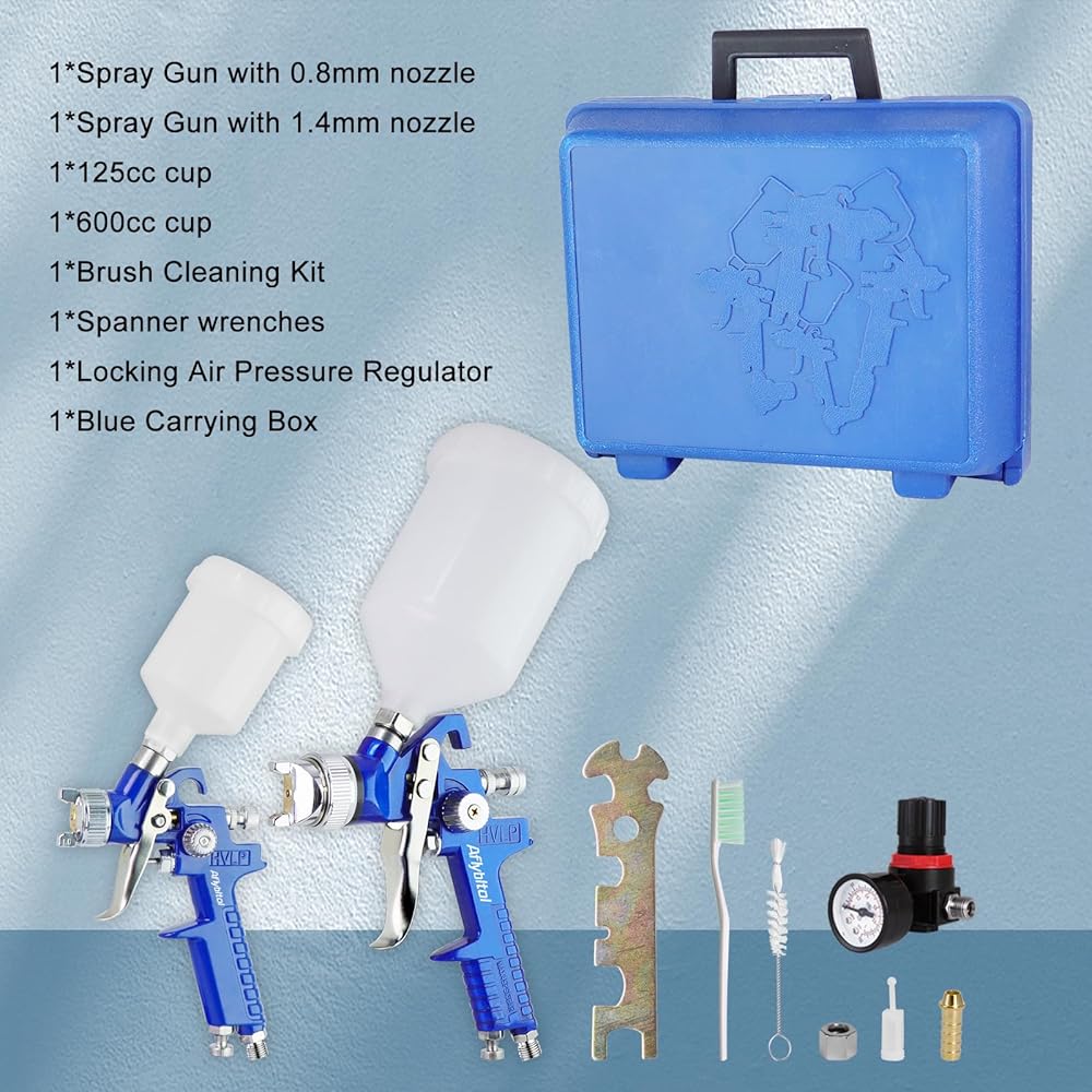 You Will Get: 1* 0.8mm HVLP paint gun, 1*1.4mm HVLP paint gun, 1*125ml and 600ml capacity paint cups, and 1* Pressure regulating gauge.