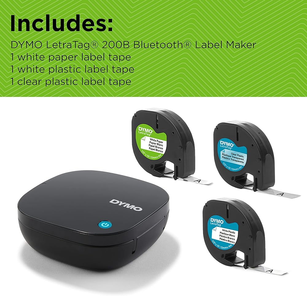 INCLUDES: DYMO LetraTag 200B Bluetooth Label Maker with 1 white paper label tape, 1 white plastic label tape, 1 clear plastic label tape
