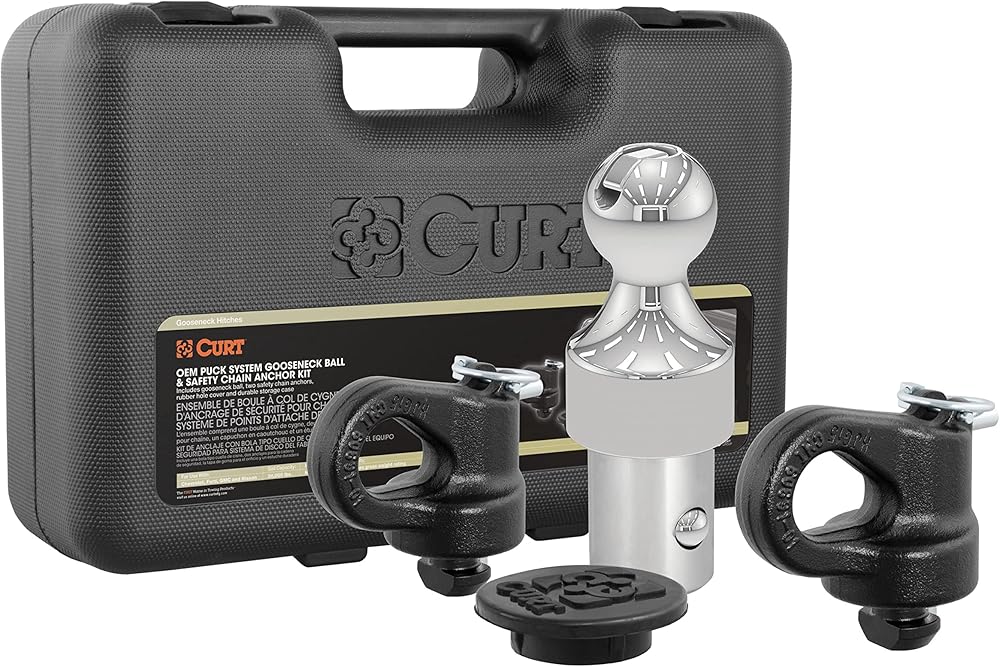 Outfitting your pickup to tow gooseneck trailers is easy with the CURT OEM puck system gooseneck ball and safety chain anchor kit. The components of this 38K kit easily drop into the truck bed pucks, instantly equipping the truck for gooseneck towing. The kit includes a gooseneck ball, safety chain anchors, a rubber hole cover and a durable storage case. It is designed specifically for the Chevrolet, Ford, GMC or Nissan Titan XD puck system and cannot be installed without it. It is rated for 38,000 lbs. GTW and 9,500 lbs. vertical load. The OEM puck system gooseneck ball perfectly fits into the center ball hole and provides a 2-5/16" ball to fit most standard gooseneck trailers. It features with a patented installation system, operating with a simple quarter-turn latch lock for ease of use and a secure mount. Retention balls, built into the shank, keep the gooseneck ball fixed into the receiver hole and keep your trailer locked on tight. Also included in the kit are CURT OEM puck system gooseneck safety chain anchors. Like the gooseneck ball, these patented anchors are made specifically for Chevrolet, Ford, GMC or Nissan Titan XD pickup trucks with the puck system and provide a reliable connection for your gooseneck trailer. They feature a simple drop-in installation system with no tools required, and they offer large safety chain loops to accept heavy-duty clevis hooks. These safety chain anchors are constructed from heavy-duty, cast steel and have a highly durable powder coat finish. Finally, this gooseneck puck system kit includes a tough rubber hole cover to keep water, dirt, grime and rust out of the gooseneck ball hole. The cover installs with a friction fit and helps extend the life of your gooseneck hitch. We also include a durable plastic storage case with each kit to keep the components protected and together for easy storage. The case can be stored inside your truck or truck bed tool box to keep the ball and anchors on-hand whenever you need them.