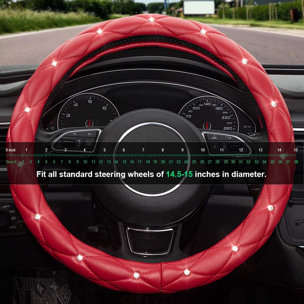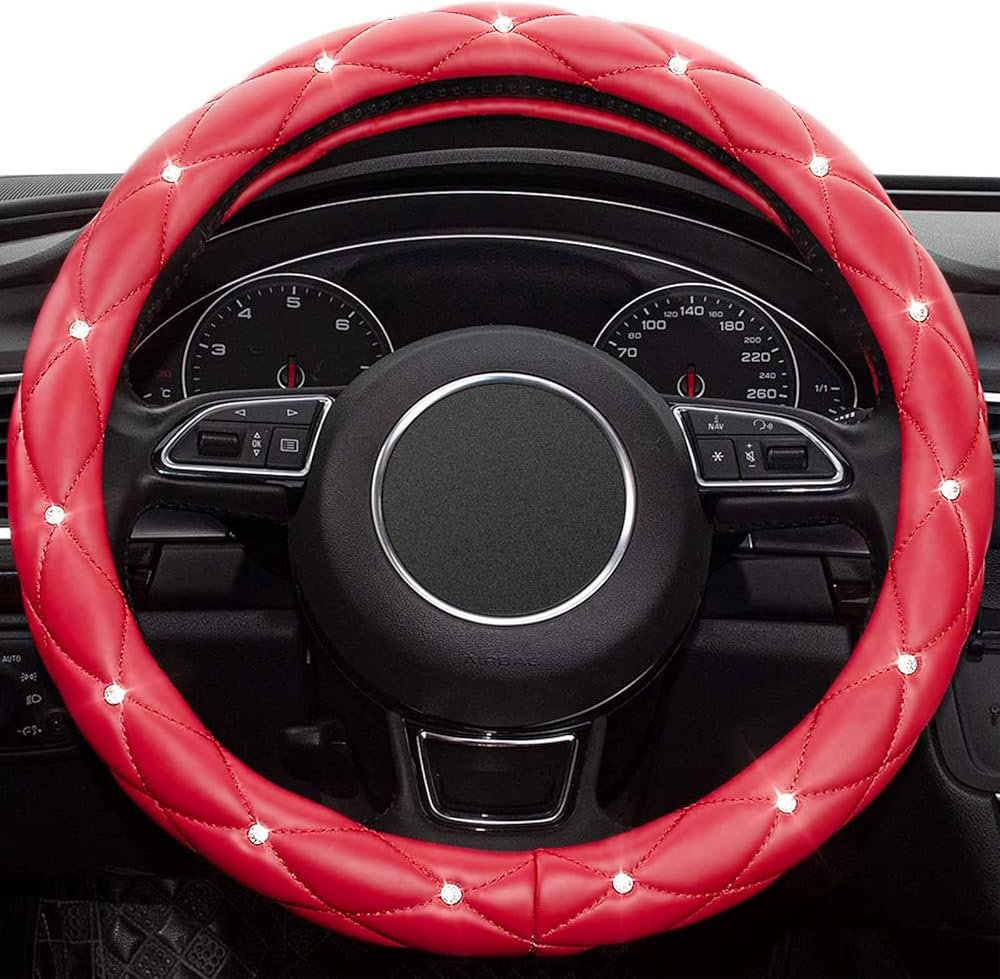 Xizopucy Red Steering Wheel Cover, Leather Car Steering Wheel Cover, Crystal Rhinestones Anti-Slip Soft Accessories for Women and Girl Universal Fit 14.5-15 Inch