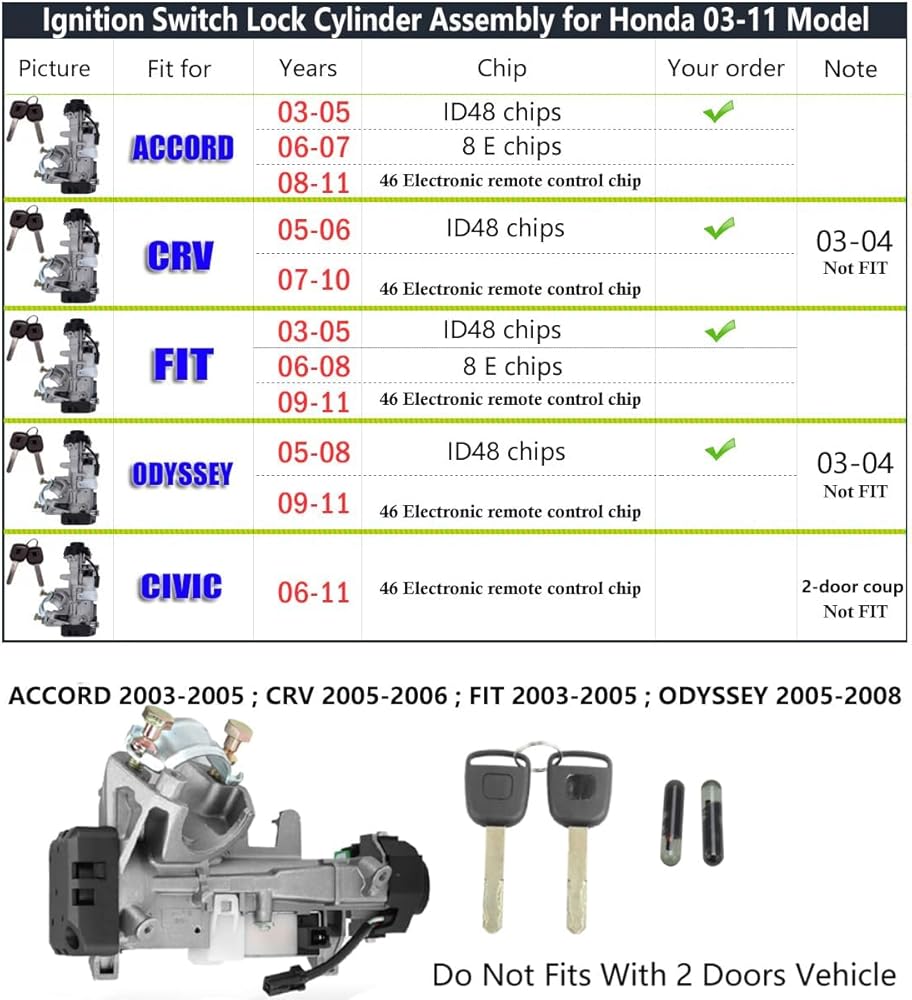 This Ignition Lock Cylinder kit is a replacement part for Honda 2003-2005 Civic; Honda 04-05 S2000; Honda 02-06 CR-V; Honda 03-11 Element. **But Do Not Fit 2 Doors Vehicle!!!
