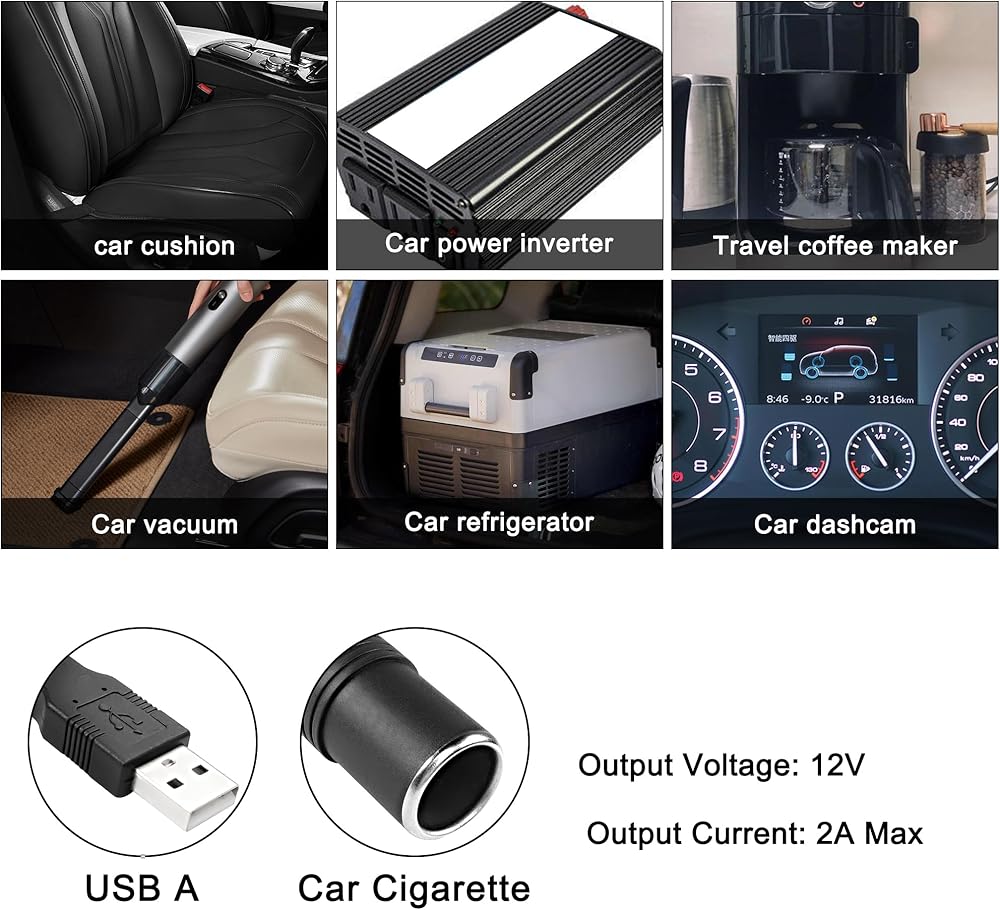 • USB input is 5V2A cigarette lighter output is 12V 8W, easy to solve the problem of mobile power supply for car electronic products, especially the car recorder parking monitor problem.