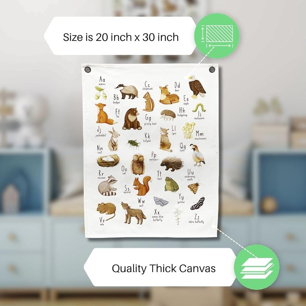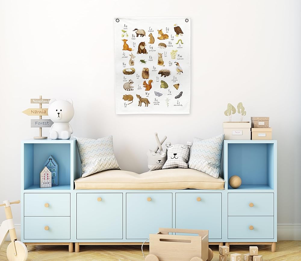 قم بتحويل مساحة طفلك باستخدام لافتة الحروف الأبجدية لحضانة وودلاند. تتميز برسوم توضيحية جذابة لحضانة حيوانات الغابة، وهي ديكور مثالي للحوائط في الغابة. ارفع غرفة طفلك بديكور فريد لحضانة حيوانات الغابة.