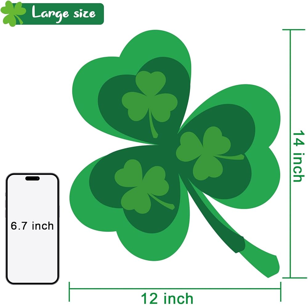 Extra Large Shamrock Stickers: The Shamrock clings features extra large shamrock designs.The largest shamrock patterns is about 12*14 inch,and the full sheet size is 12.99*16.9inch.Rich clovers of varying sizes will meet your spring decorating needs and highlight the festive atmosphere.