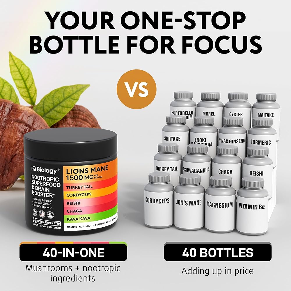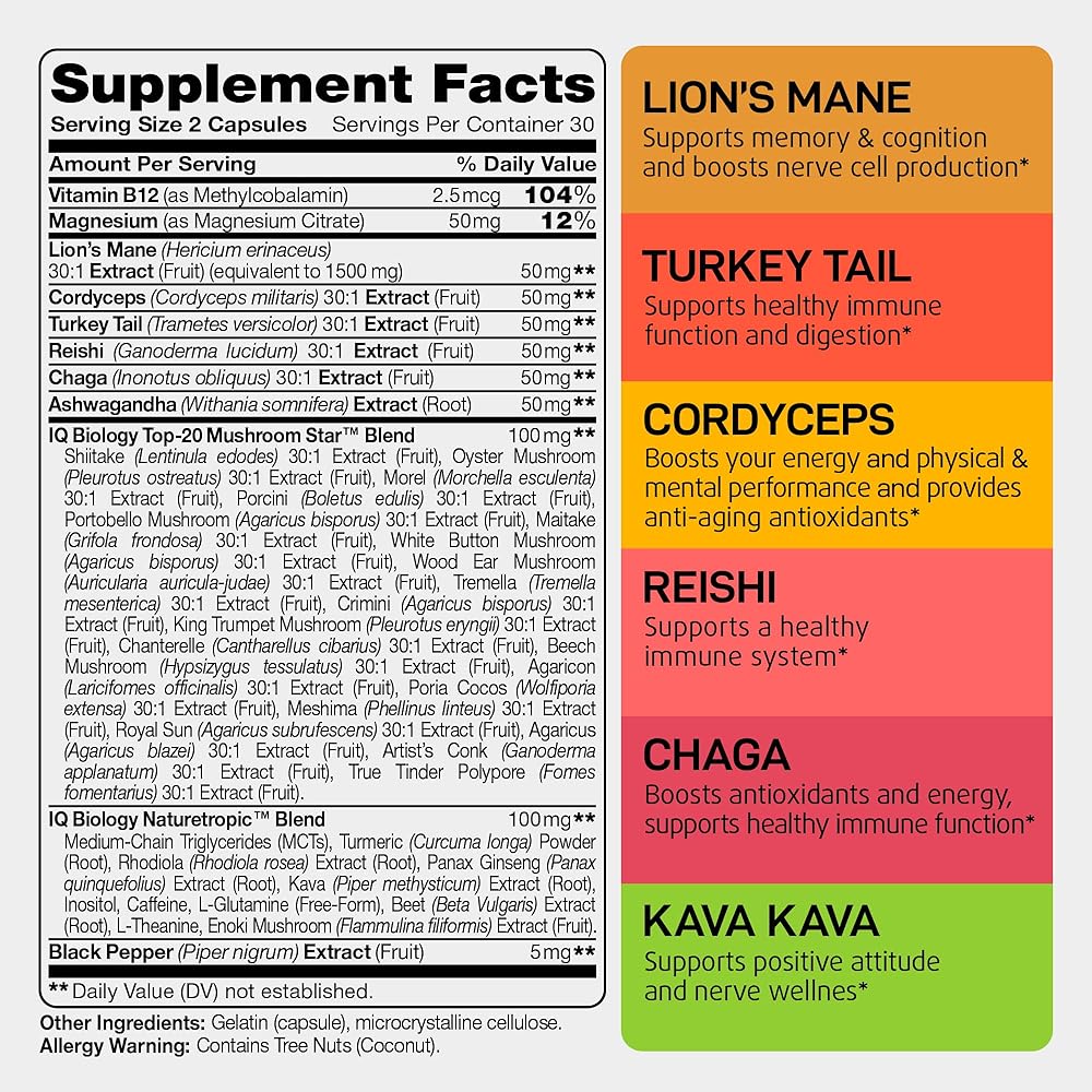 Lions Mane Supplement Capsules - Looking for lions mane supplement? Our IQ Biology Brain Supplements for Memory and Focus* is not only Lion's Mane but also magnesium supplement, ashwagandha capsules, turmeric supplement, l theanine, inositol supplement, rhodiola supplement, B12 Vitamins, caffeine pills, kava extract, reishi mushroom, turkey tail mushroom capsules, ginseng and more. Not a mushroom powder, so no need to mix everyday dose mushroom coffee with it. 2 capsules a day and no aftertaste.
