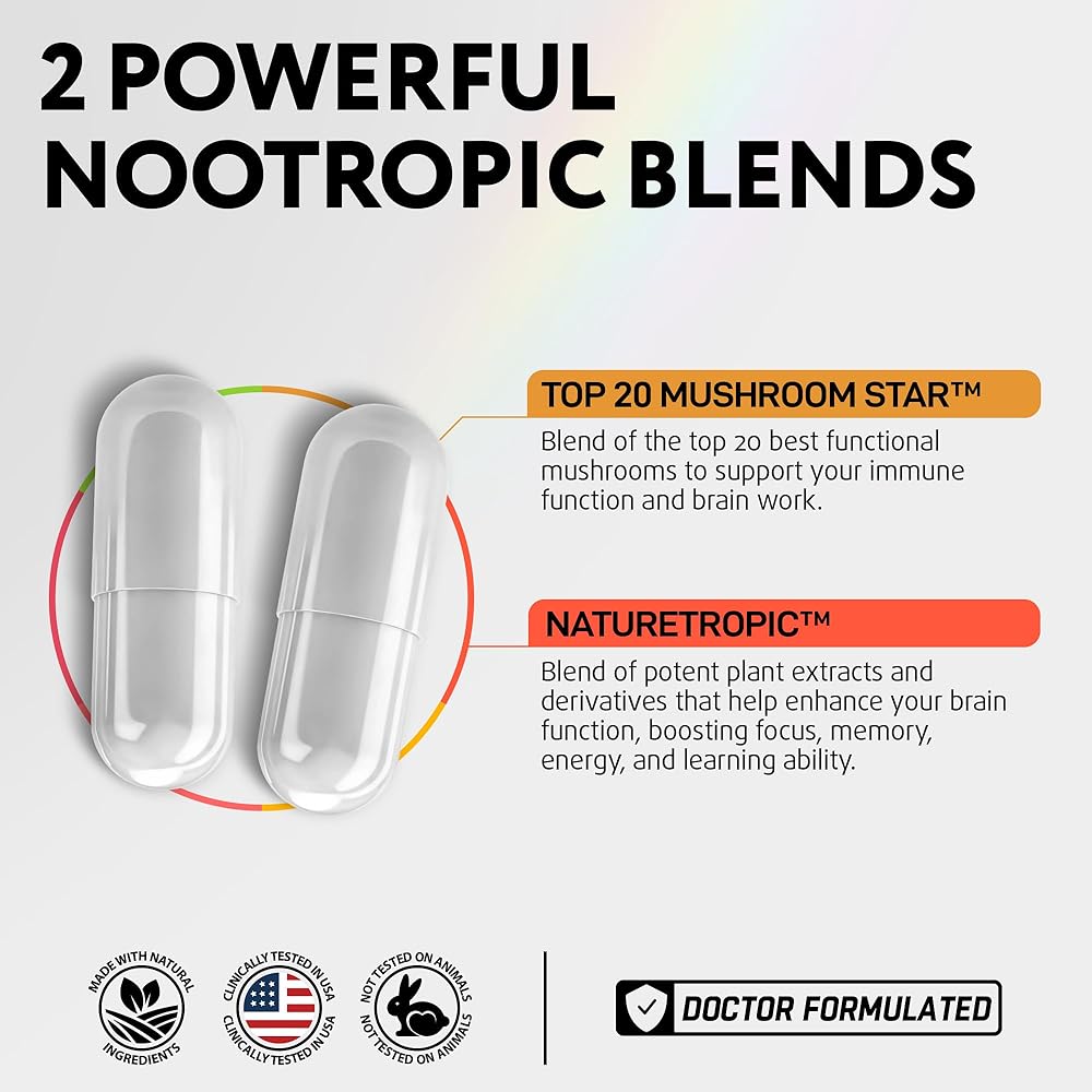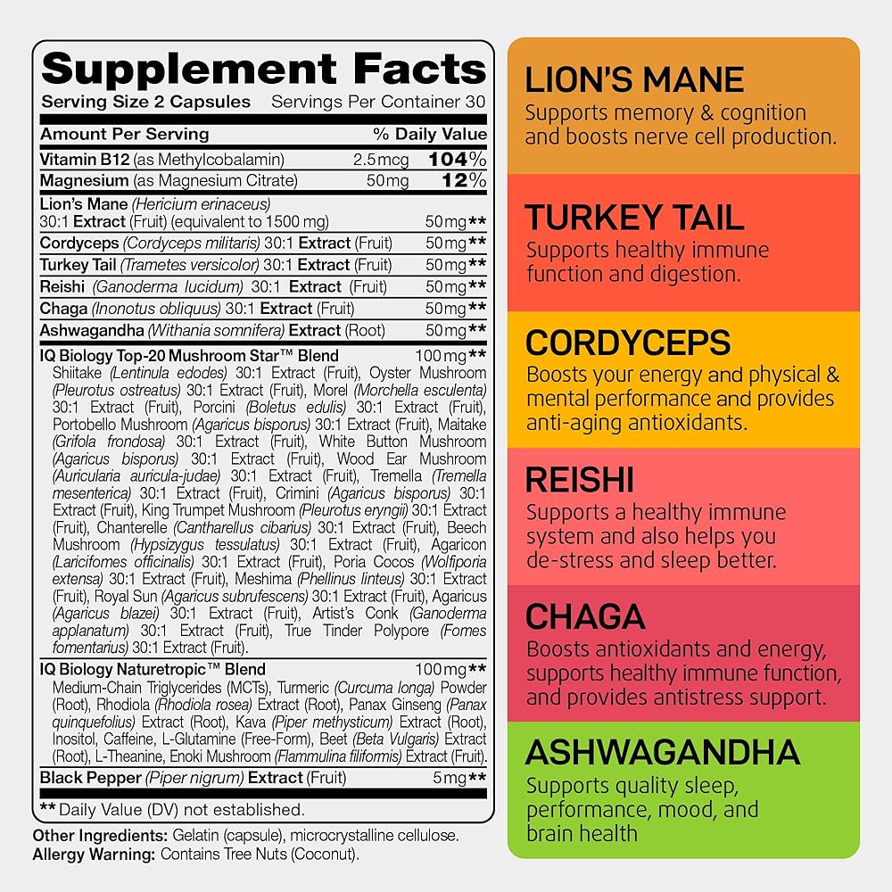 Nootropic Supplement TOP-20 Mushroom Blend - Our Mushroom Pills contain IQ Biology TOP-20 Mushroom Star Blend with 20 powerful 30 to 1 mushroom extracts: Shiitake Mushrooms, Oyster Extract Mushroom, Morel Mushrooms, Porcini, Portobello Mushroom, Maitake Mushroom, White Button Mushroom, Wood Ear Mushroom, Tremella Mushroom, Crimini, King Trumpet Mushroom, Chanterelle Mushrooms, Beech Mushroom, Agaricon, Poria Cocos, Meshima, Royal Sun, Agaricus, Artist's Conk, and True Tinder Polypore.