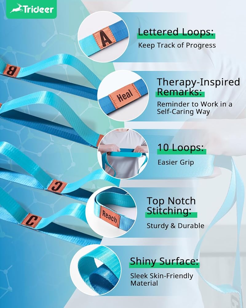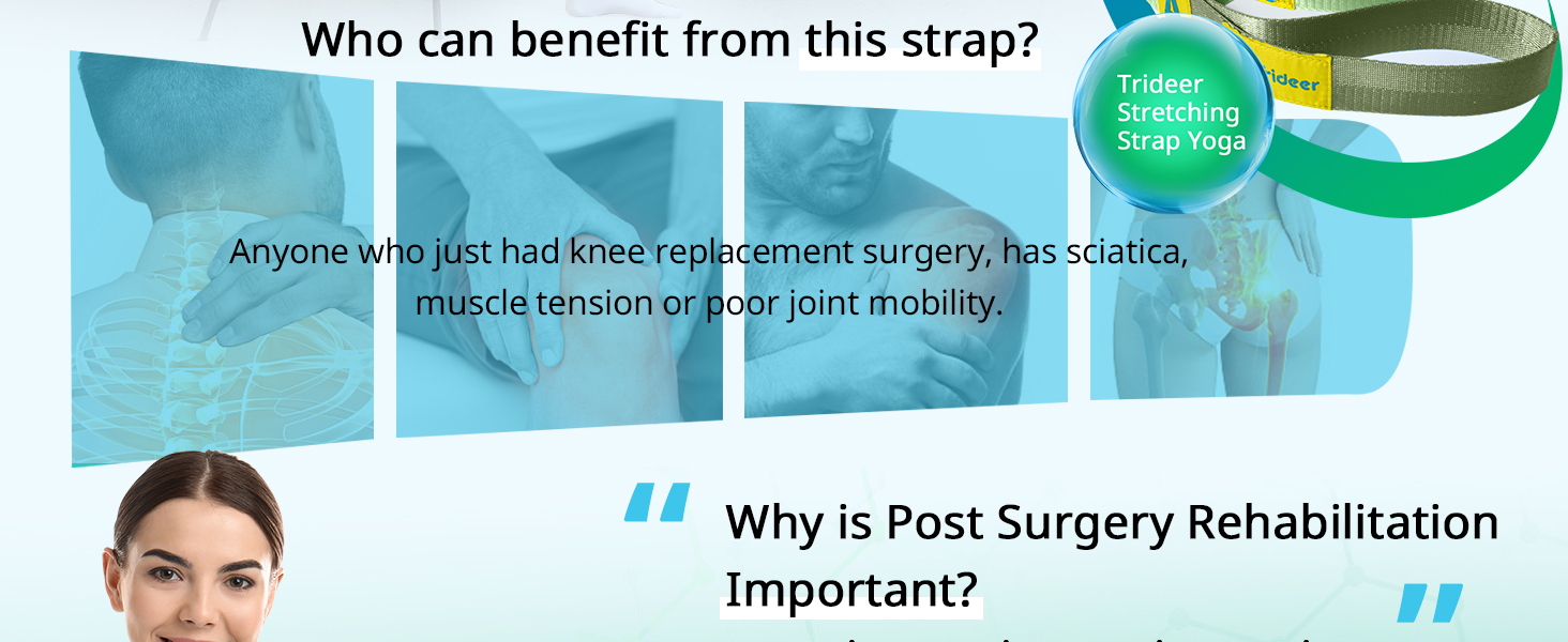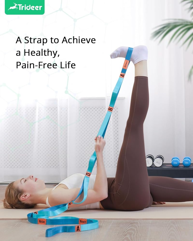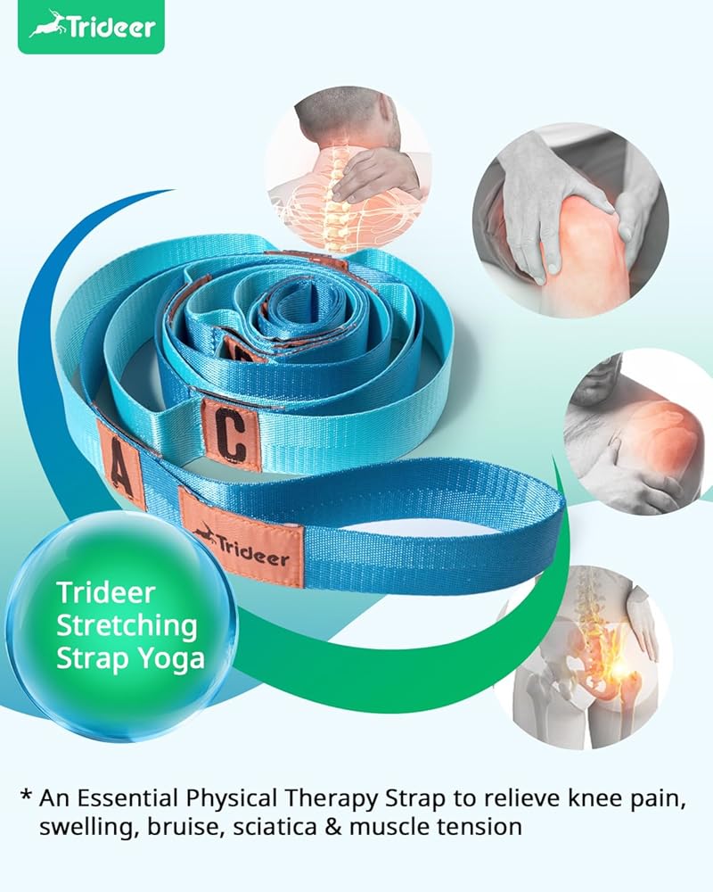 The purpose of Trideer stretching strap is to provide everyone with high-quality, low-cost and durable physiotherapy stretching strap.After preliminary market research and product material research, we selected the durable Polyester material in order to make it more durable and safe for everyone to use, because too soft materials are easy to slip and cause secondary injuries.The design of our 10-ring is also based on extensive research.Suitable for most people's height, you can safely use it for stretching and physical therapy,You can use it to help you recover from physical therapy after knee replacement surgery to avoid the fatigue of going to and from the physical therapy room. It can also be used for daily muscle stretching and muscle relaxation, or you can also use it to warm up before and after doing yoga. Help you complete yoga movements better.