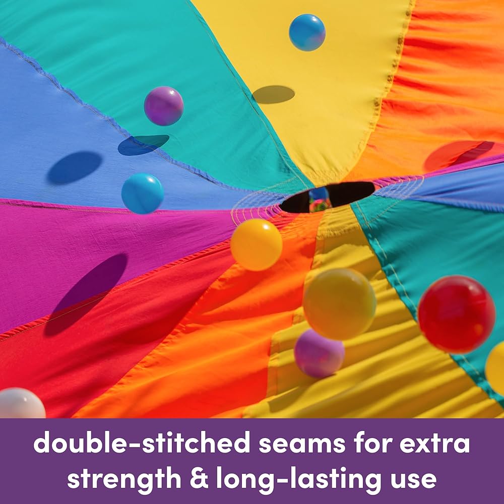 🌈 EYE-CATCHING COLORS - Our parachutes come in vibrant colors of red, green, yellow, and blue, making them an eye-catching attraction for children of all ages (and adults too!). They promote cooperative group play and coordination, making them an ideal product for rainbow parachute games for kids.