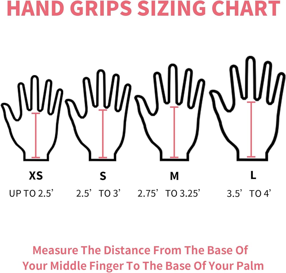 - Grips Size: XS - up to 2.5', S - 2.5' to 3', M - 2.75' to 3.25', L - 3.5' to 4'.