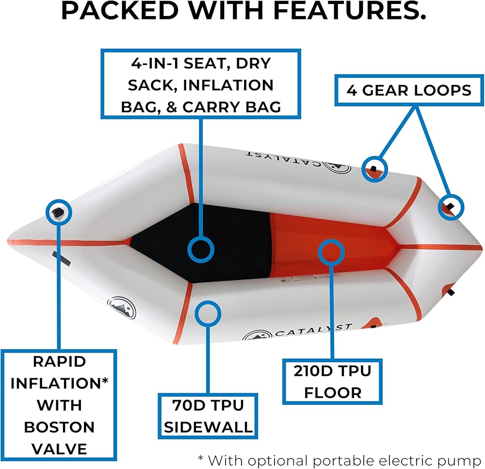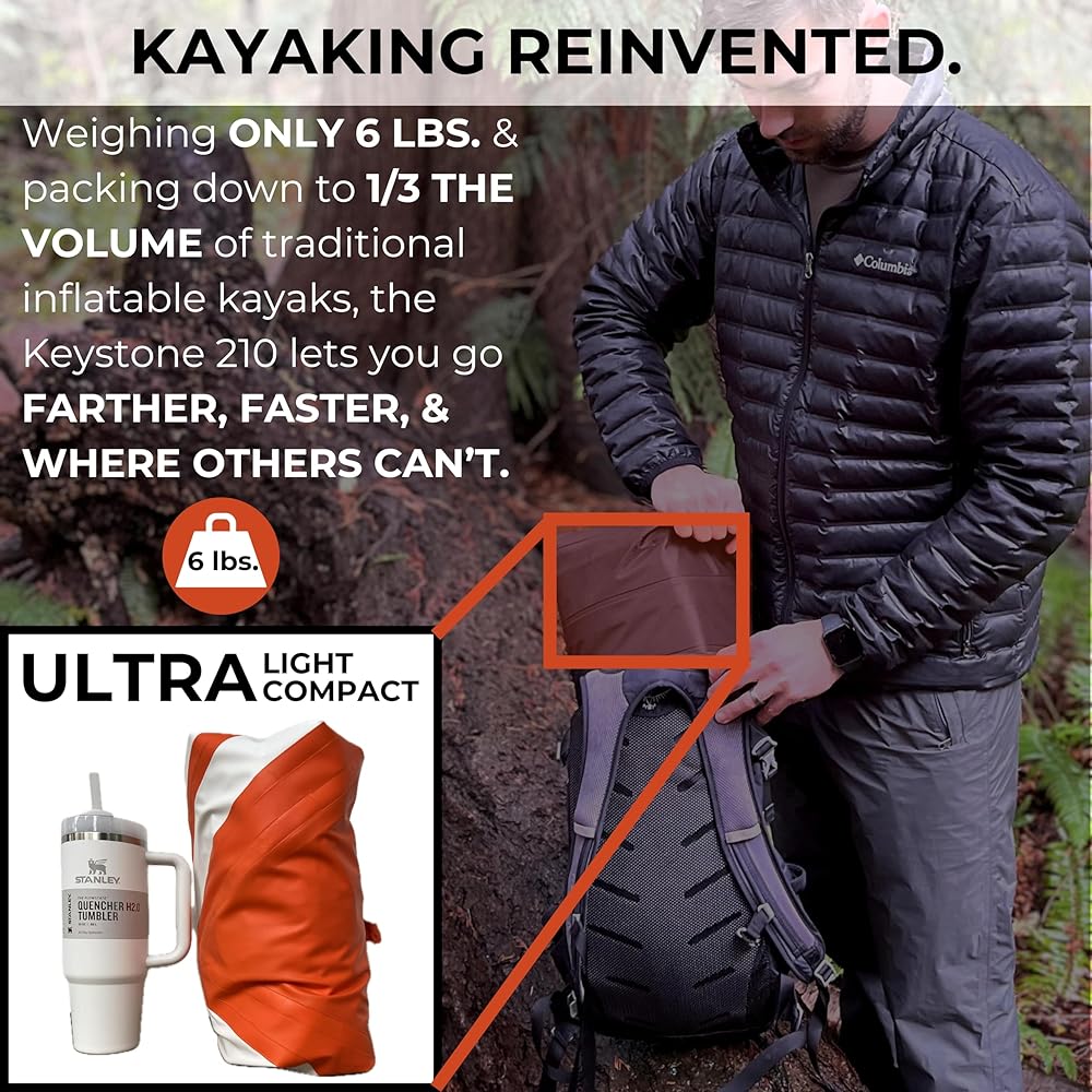 Introducing the Keystone 210, a pinnacle of innovation from Catalyst Outdoors, designed for the solo adventurer seeking the freedom to explore. Our ultralight packraft, weighing merely 6 pounds, is engineered for those who chase spontaneity and ease in their outdoor pursuits. It stands as a testament to our commitment to lightweight innovation, allowing you to venture further with less effort. The Keystone 210 is constructed with resilience at its core, featuring a robust 70D TPU tube and a 210D TPU floor, making it exceptionally resistant to abrasions and punctures. This premium Thermoplastic Polyurethane (TPU) ensures unmatched durability, safeguarding your journey against the unpredictabilities of nature. With the Keystone 210, Catalyst Outdoors merges durability with lightweight design, offering peace of mind on every adventure. This packraft redefines compactness and convenience. Its space-saving design folds down to about one-third the volume of traditional inflatable kayaks, making it an ideal choice for minimalistic travelers. It includes a versatile 4-in-1 Inflation Bag that serves as an Inflatable Seat, Dry Sack, and Carrying Case, alongside a repair patch kit, ensuring you're prepared for any adventure. Though it can be inflated using the included bag, the optional Giga Pump (sold separately) significantly reduces setup time, letting you spend more time exploring and less time on the shore. Catalyst Outdoors Packrafts are not just about moving from point A to point B; they're about elevating your entire outdoor experience. Capable of supporting up to 265 pounds and accommodating adventurers up to 6 foot 6 inches tall, the Keystone 210 brings you closer to nature's beauty with every paddle stroke. From tranquil alpine lakes to meandering rivers, it invites you to redefine adventure on your terms. The Keystone 210 does not include a paddle or life vest, providing you the flexibility to customize your gear as you see fit. Backed by a lifetime warranty against manufacturer defects, Catalyst Outdoors is committed to your long-term satisfaction and confidence in every purchase. Embark on your next adventure with the Keystone 210 by Catalyst Outdoors and experience the difference in portability, durability, and convenience. Elevate your adventures, explore with ease, and embrace the freedom that comes with the ultimate ultralight packraft.