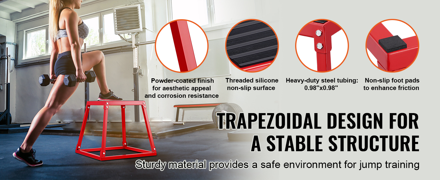 Durable and Stable: This plyometric platform box features a trapezoidal workout design, ensuring a sturdy structure. The welded parts are solid and durable, maintaining stability even during high-intensity workouts. With a super-strong 500-pound weight capacity, it caters to a variety of training needs. The steel tubing surface is coated with a powder finish, providing both aesthetics and corrosion resistance, creating a stable environment for jump training.