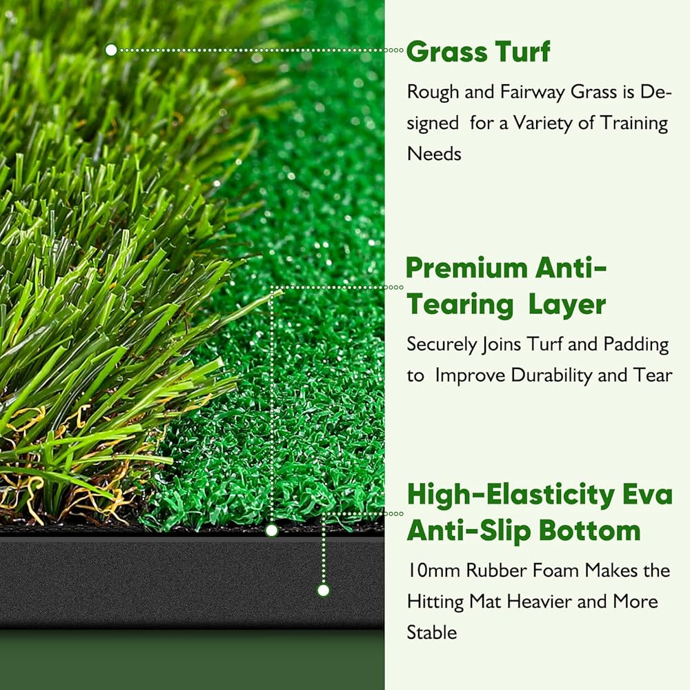 Durable Golf Mat : Golf mats practice outdoor is designed by golfers for long-term training. It features a tear-resistant layer for enhanced durability and strength. With excellent cushioning, it absorbs impact, protects your wrists and neck, and can withstand thousands of swings and practice sessions.