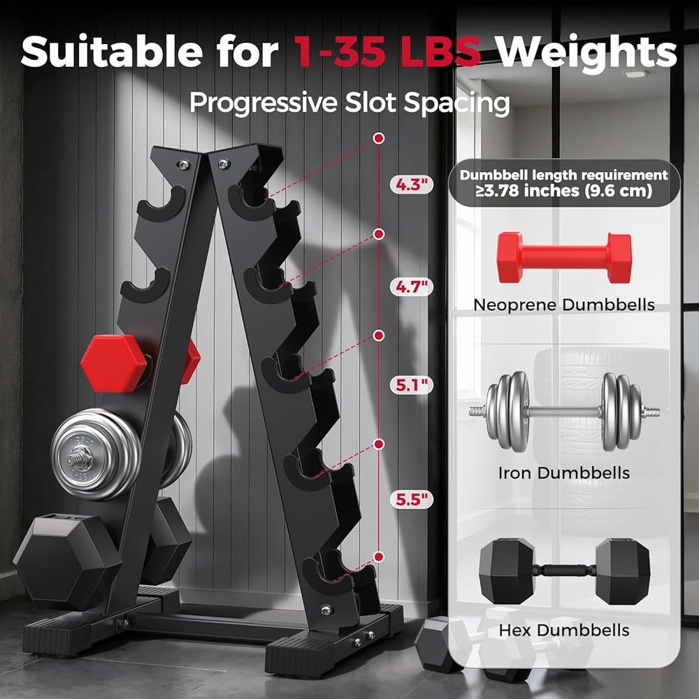 【For 1-35 LBS Dumbbells】With a progressive slot spacing design, The dumbbell rack is suitable for 1-35 pound dumbbells, such as neoprene dumbbells, hex dumbbells, Peloton dumbbells, etc.