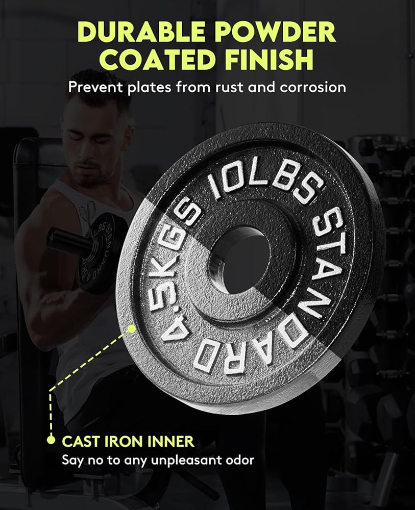【Premium Material】All plates feature a durable, black powder coated finish to prevent the plates from rust and corrosion. these plates are labeled in both LB and KG for easy recognition, which enables you to focus more on your fitness program
